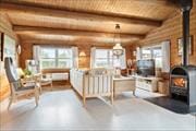 Wenn Sie und Ihre Familie mal so richtig in ruhiger Umgebung entspannen möchten, dann ist dieses Ferienhaus das richtige für Sie. Schon beim ersten Anblick dieses roten Blockhauses fährt man automatisch runter. Vom einladenden Eingangsbereich aus gelangen Sie zum Bad, das über eine Fußbodenheizung verfügt. Von dort aus geht auch das erste Zimmer mit zwei Einzelbetten ab. Geht man weiter, kommt man in die Küche/Mehrzweckraum mit Geschirrspüler, Mikrowelle, Kühl-Gefrierkombination, Herd und was man sonst so für den Urlaubsaufenthalt benötigt, außerdem einen Esstisch, an dem die ganze Familie Platz findet. Von der Küche aus geht es weiter in den Wohnbereich, ausgestattet mit Kaminofen, Fernseher mit sowohl dänischen und deutschen Sendern und einem gemütlichen Ecksofa. Vom Wohnzimmer aus gelangen Sie in die beiden anderen Schlafzimmer des Hauses, wovon eines mit Doppelbett und das andere mit zwei Einzelbetten ausgestattet ist. Vom Wohnzimmer aus geht es auch auf die überdachte Terrasse hinaus. Für die kleinen Gäste stehen ein Kinderbettchen und ein Hochstuhl zur Verfügung. Auch Hunde sind hier sehr willkommen.