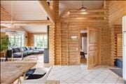 Schön eingerichtetes Blockhaus mit Holzterrasse nach Westen und perfekter Lage direkt neben einer großen offenen Grünfläche.
