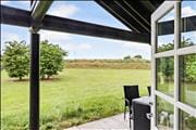 Vom Wohnzimmer aus gelangt man auch auf die herrliche, nach Südwesten ausgerichtete Holzterrasse, auf der vor allem die Abendsonne in perfekter Umgebung genossen werden kann. Von der Terrasse aus betreten Sie direkt einen großen grünen Außenbereich, der viel Platz für Ballspiele und Spiel mit der ganzen Familie bietet sowie die Möglichkeit, auf die schönen Felder zu blicken, die das Ferienhausgebiet umgeben.