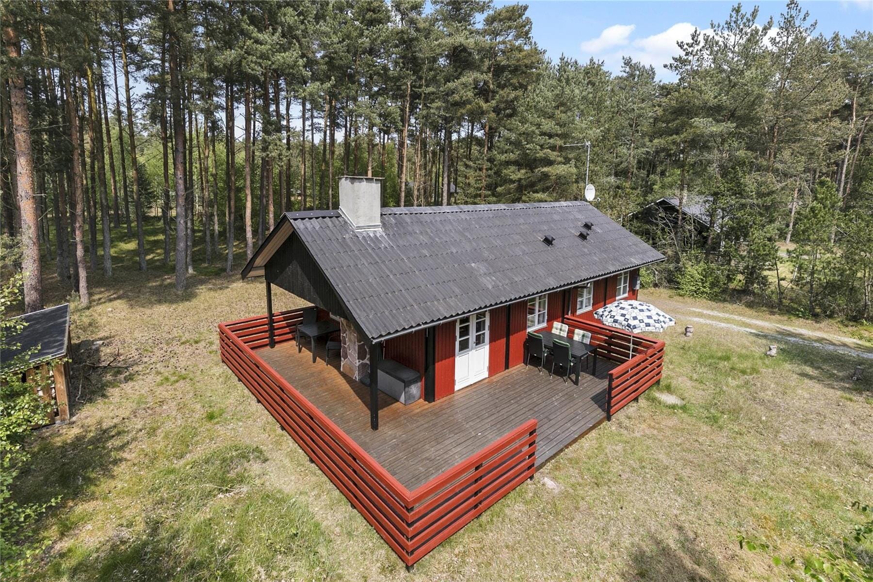 Draußen wartet eine einladende Terrasse auf dich, auf der sich die Ruhe sofort bemerkbar macht. Hier findest du Platz für kleine und große Ferienmomente – ob mit einer Tasse Kaffee in der Vormittagssonne, einem Nickerchen im Liegestuhl oder einem gemütlichen Grillabend, während die Dämmerung einsetzt. Der Duft vom Grill mischt sich mit dem leichten Rascheln der Bäume, und die friedliche Atmosphäre lässt den Alltag schnell vergessen. Das Grün rund um das Haus vermittelt dir das Gefühl, mitten in der Natur zu sein, und du findest immer ein gemütliches Plätzchen, um ganz im Moment zu sein. Die Terrasse wird schnell zum natürlichen Treffpunkt an warmen Tagen, und du spürst, wie die Zeit hier ihr eigenes, angenehmes Tempo annimmt.