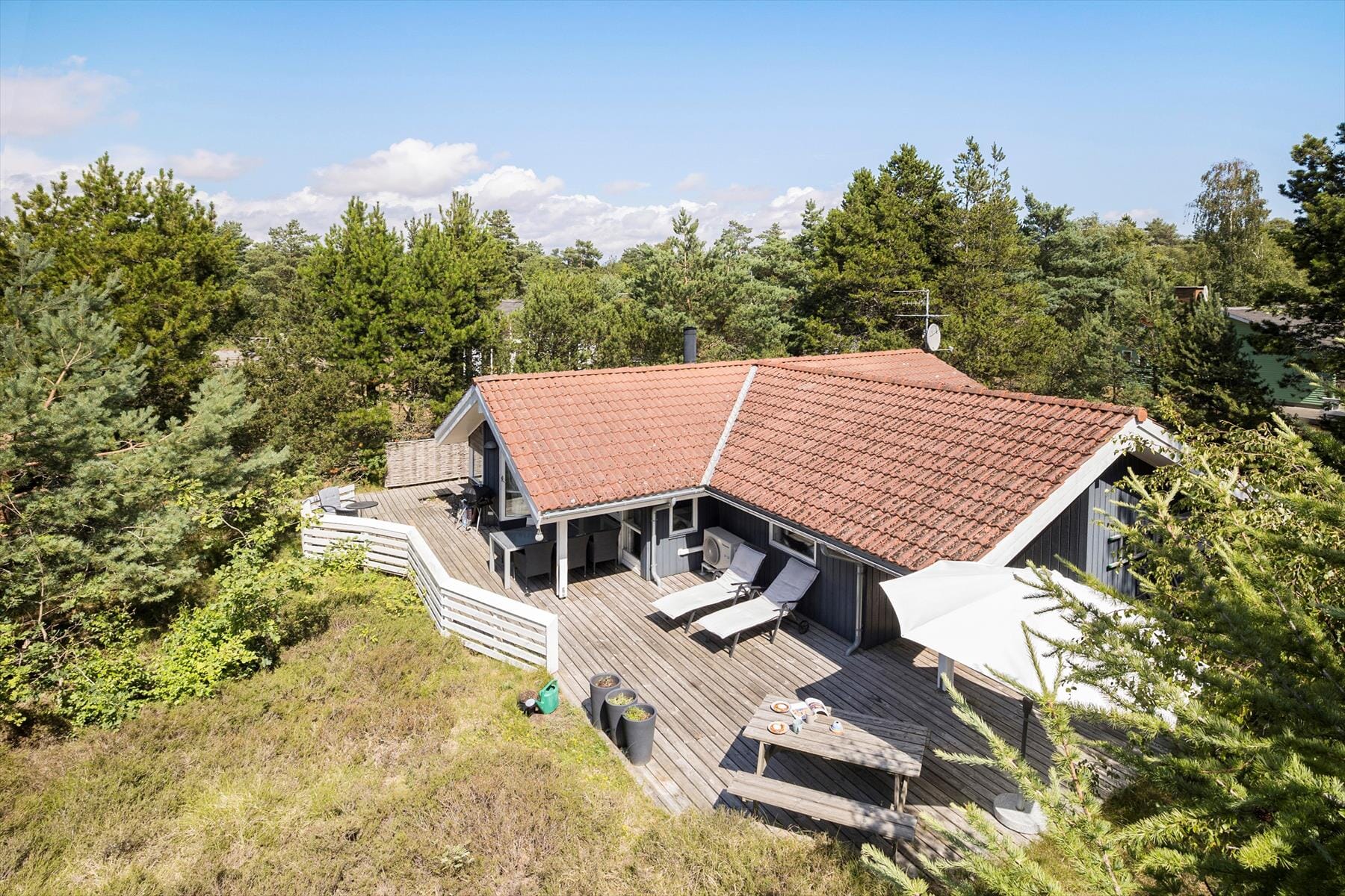 Draußen erwartet dich eine gemütliche Terrasse, die schnell zu deinem natürlichen Treffpunkt im Ferienhaus wird. Hier kannst du den Morgen mit einer ruhigen Tasse Kaffee beginnen, während du den Vögeln lauscht und die frische Meeresluft über das Grundstück streicht. Die bequemen Gartenmöbel und Liegestühle laden zum Entspannen ein – ob du die Sonne genießen oder einen schattigen Platz finden möchtest. Wenn der Abend naht, ist die Terrasse der perfekte Ort für einen Grillabend: Du zündest den Grill an, die Düfte breiten sich aus, und du spürst, wie die tiefe Ruhe dieses Ortes dich umgibt, während das Licht langsam weicher wird. Das Grundstück rund um das Haus bietet viel Platz zum Spielen, Erholen oder einfach, um einen Moment für dich zu genießen und den Geräuschen der Natur zu lauschen. Durch die kurze Distanz zum Strand bist du im Handumdrehen am Wasser – ideal für einen spontanen Sprung in die Wellen, einen Spaziergang barfuß im Sand oder eine kleine Auszeit mit Blick aufs Meer.