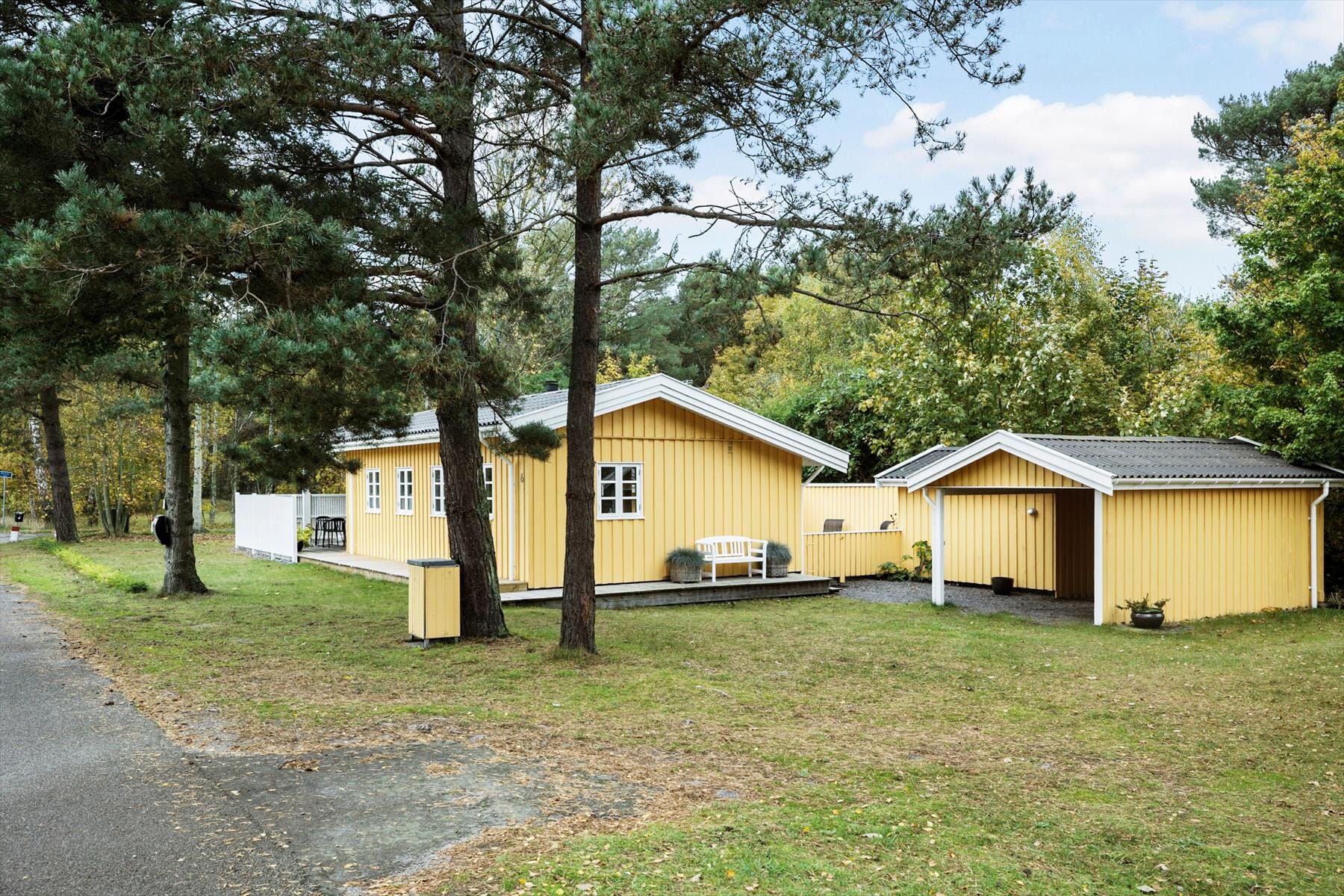 Am Eingang des Hauses gibt es eine eingezäunte Terrasse, auf die die Sonne leicht fallen kann und die Schutz vor dem Wind bietet. Die überdachte Terrasse befindet sich auf der anderen Seite des Hauses, wo du sitzen und die kleine Straße, die zum Wasser hinunterführt, beobachten kannst. Es ist ein offenes Grundstück mit einigen Sträuchern und Bäumen. Neben dem Haus gibt es einen Carport.