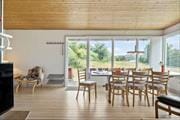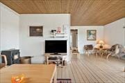 Großes Wohnzimmer mit Fernsehecke und Essbereich, Holzfußboden sowie Ausgang zur offenen Terrasse. Große Fenster in Richtung Ostsee. Kleine Küche. Ein Schlafzimmer mit Doppelbett. Zwei Schlafzimmer mit zwei Einzelbetten. Kleines Badezimmer mit Dusche.