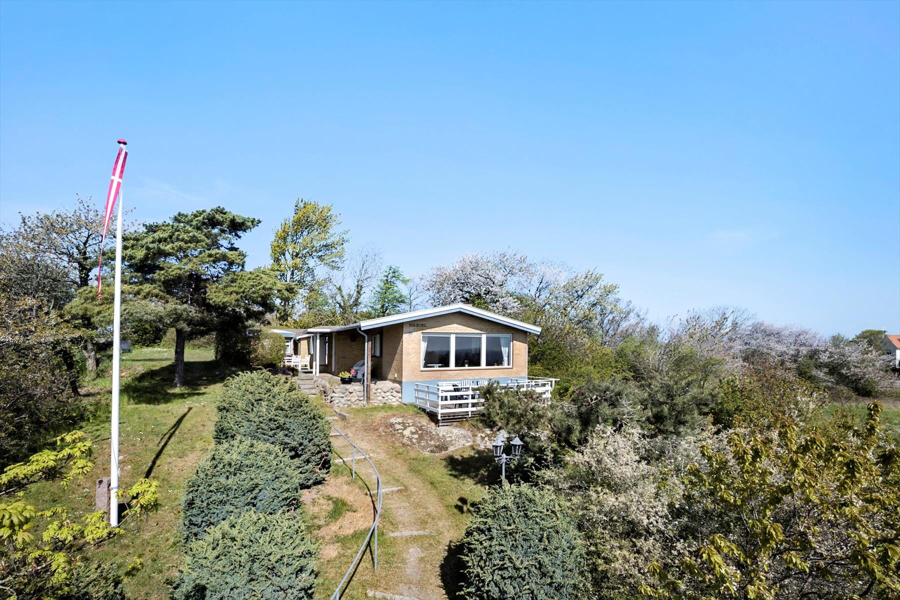 Das Ferienhaus liegt erhöht, das über eine lange Sandsteintreppe hinauf erreicht wird. Das große Grundstück lädt zum Austoben ein oder bietet einen Platz zum Sonnen. Schöne, große möblierte Terrasse, auf der du den Tisch mit Spezialitäten von Bornholm decken und das Essen in einer idyllischen Umgebung genießen kannst. Damit du den Sommer etwas verlängern kannst, nutze die kleine, gemütliche und überdachte Terrasse mit Blick über das Grundstück. Es ist möglich bis zur Treppe des Hauses heranzufahren.
