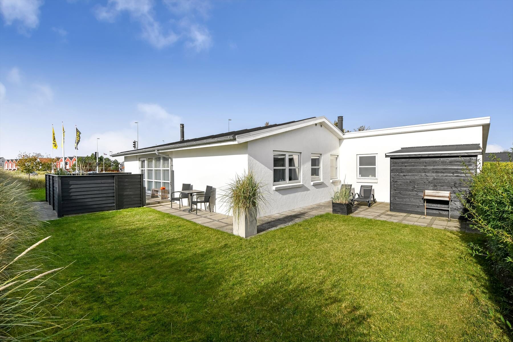 Obwohl es richtig schön ist, sich im Wohnraum aufzuhalten, wird es euch an sonnigen, warmen Tagen garantiert unwiderstehlich hinaus ins Freie ziehen. Vor der Eingangstür in Richtung Straße steht eine Terrasse zur Verfügung. Bedeutend beliebter wird bei euch allerdings die an der Südseite des Hauses gelegene Terrasse sein. Der mit Strandhafer bewachsene Naturwall und die Terrassenumrandung schirmen die Außenbereiche gut ab, sodass ihr in ruhigem Rahmen lesen, Sonnenbäder und Grillabende genießen könnt. Die Grasfläche bietet ausreichend Platz für eine Decke in der Sonne. Auf dem Schotterareal vor dem Ferienhaus können zwei Pkws geparkt werden. Alternativ bietet die Garage des Hauses eine Parkmöglichkeit.