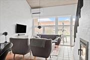 Vom Wohnraum genießen Sie direkten Zugang zur nach Süden gerichteten, sonnenverwöhnten Terrasse, die mit einem komfortablen Liegestuhl zu ausgiebigen Sonnenbädern einlädt. Dank des ebenfalls vorhandenen Grills steht gemütlichen Runden unter freiem Himmel nichts im Wege. Das Reihenhaus liegt ein wenig zurückgezogen vom Fyrvej, sodass Sie von Ihrer Terrasse aus einen Ausblick auf ein grünes Gemeinschaftsareal mit Spielgeräten genießen können.