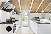 Ein außerordentlich gemütliches Ferienhaus für sechs Personen. Schöner Küchenbereich und Wohnzimmer mit Kamin. Wohnzimmer und Küche in hellen Farben und eingerichtet mit eleganten Möbeln im skandinavischen Stil. Durch die große Fensterfront können Sie auf dem großen Naturgrund das Tierleben beobachten. Zwei Schlafzimmer mit jeweils einem Doppelbett und ein Schlafzimmer mit zwei Einzelbetten (ein ist 1,70 m lang). Während Sie im Whirlpool liegen, können Sie in dem neuen Badezimmer in dem am Deckenhimmel installierten Sternenhimmel blicken.