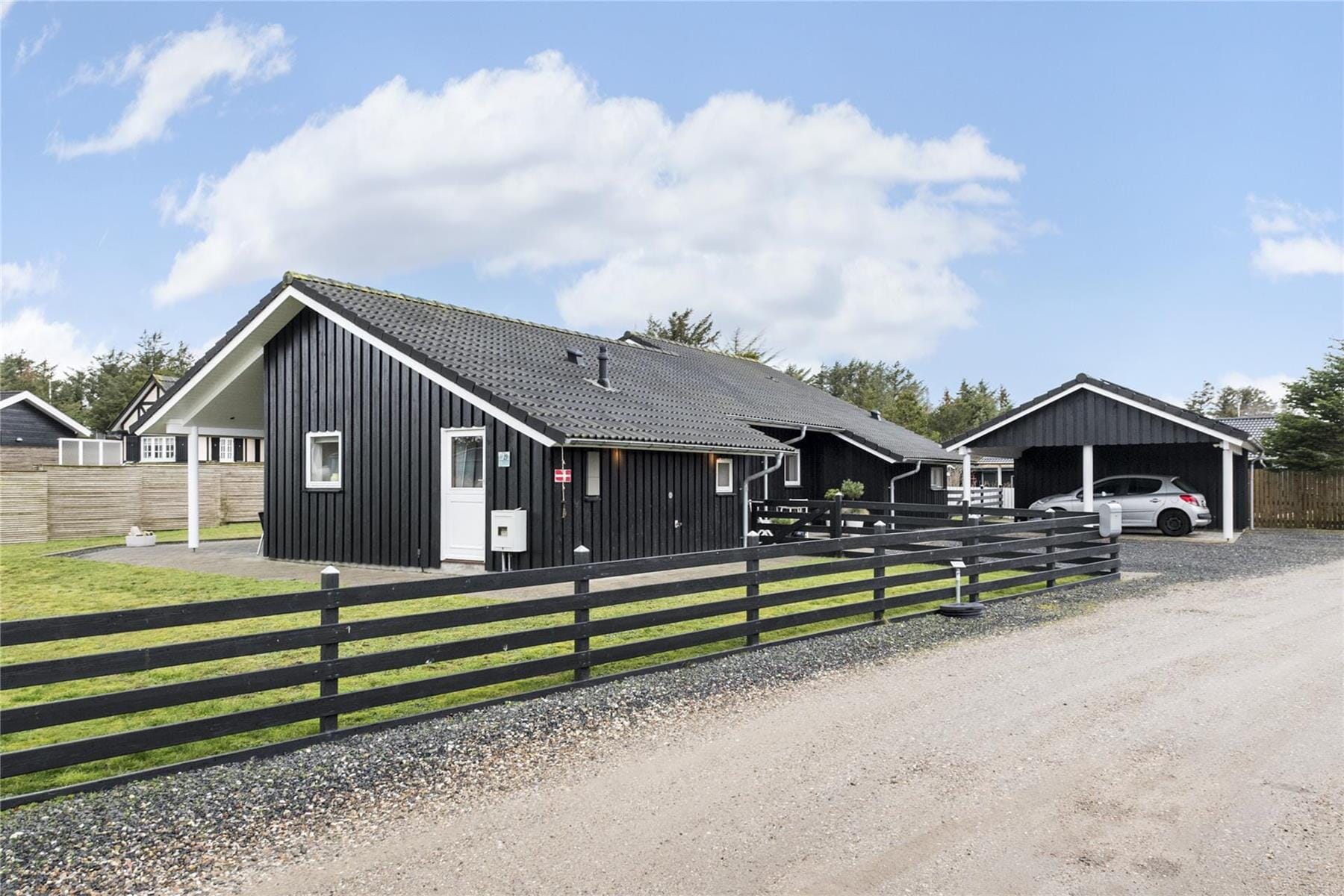 Eine geflieste Terrasse zieht sich an drei Seiten des Hauses entlang. Ein Teil der Terrasse ist sogar überdacht, sodass Sie einen angenehmen Platz mit den richtigen Sonnen- und Schutzverhältnissen finden. Der komplett eingezäunte Garten ist ideal zum Fußball spielen. Gute Parkmöglichkeiten gibt es neben dem Haus, auf der Schotterfläche und im Carport.