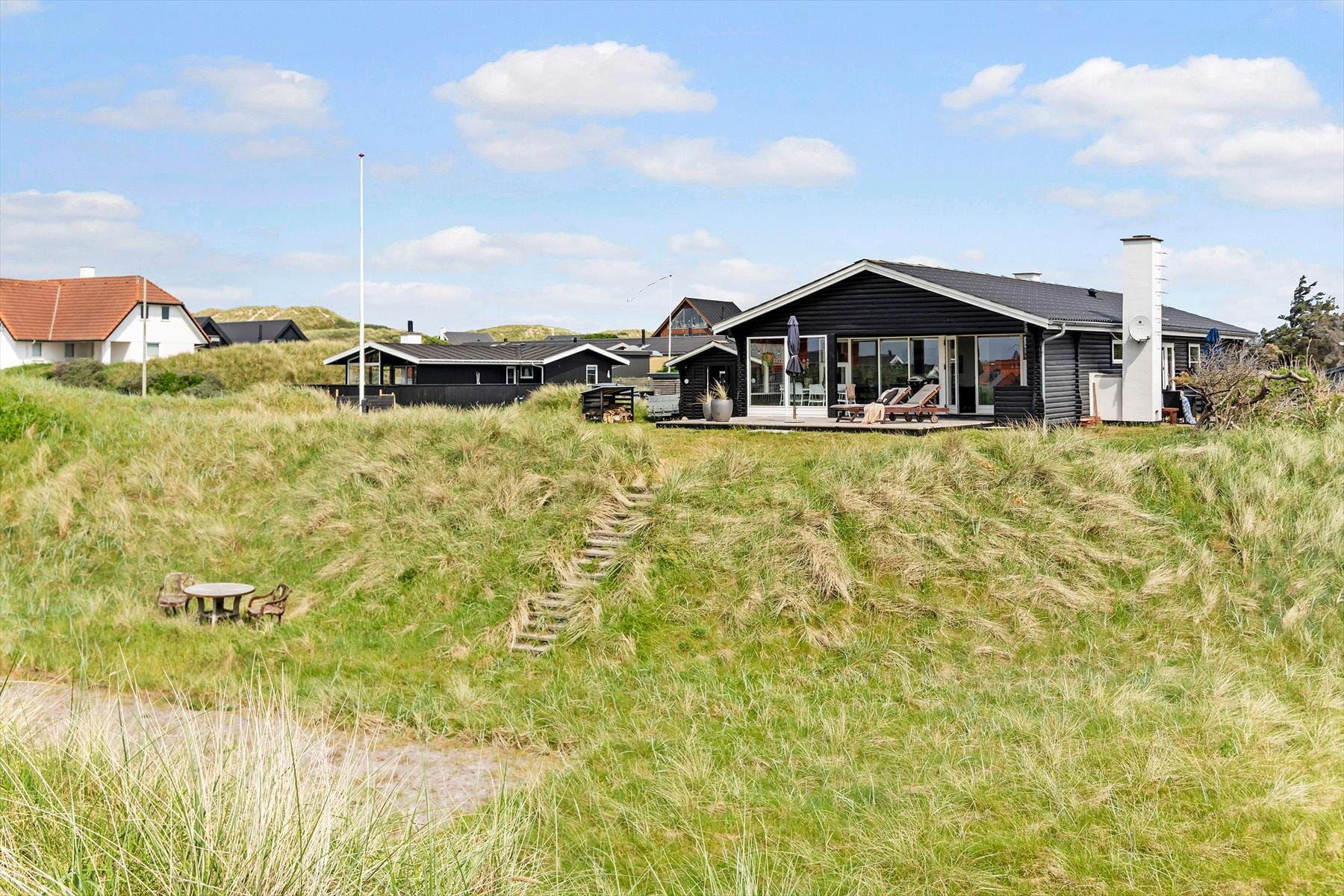 Das hügelige Grundstück bietet Ihnen mit einer Fläche von 1.264 m² ausgesprochen viel Platz zur freien Entfaltung. Nicht nur das Haus selber, sondern auch die angrenzende Terrasse liegt angenehm erhöht, sodass Sie sich auf den teilweise überdachten und abgeschirmten Außenanlagen über gute Sonnenverhältnisse und eine wunderbare Aussicht freuen dürfen. Die hauseigene Bocciabahn befindet sich in einer geschützten Dühnenkuhle, in der es sich selbst an Frühlingstagen angenehm warm anfühlt, wenn Sie mit der gesamten Familie die Kugeln schwingen.