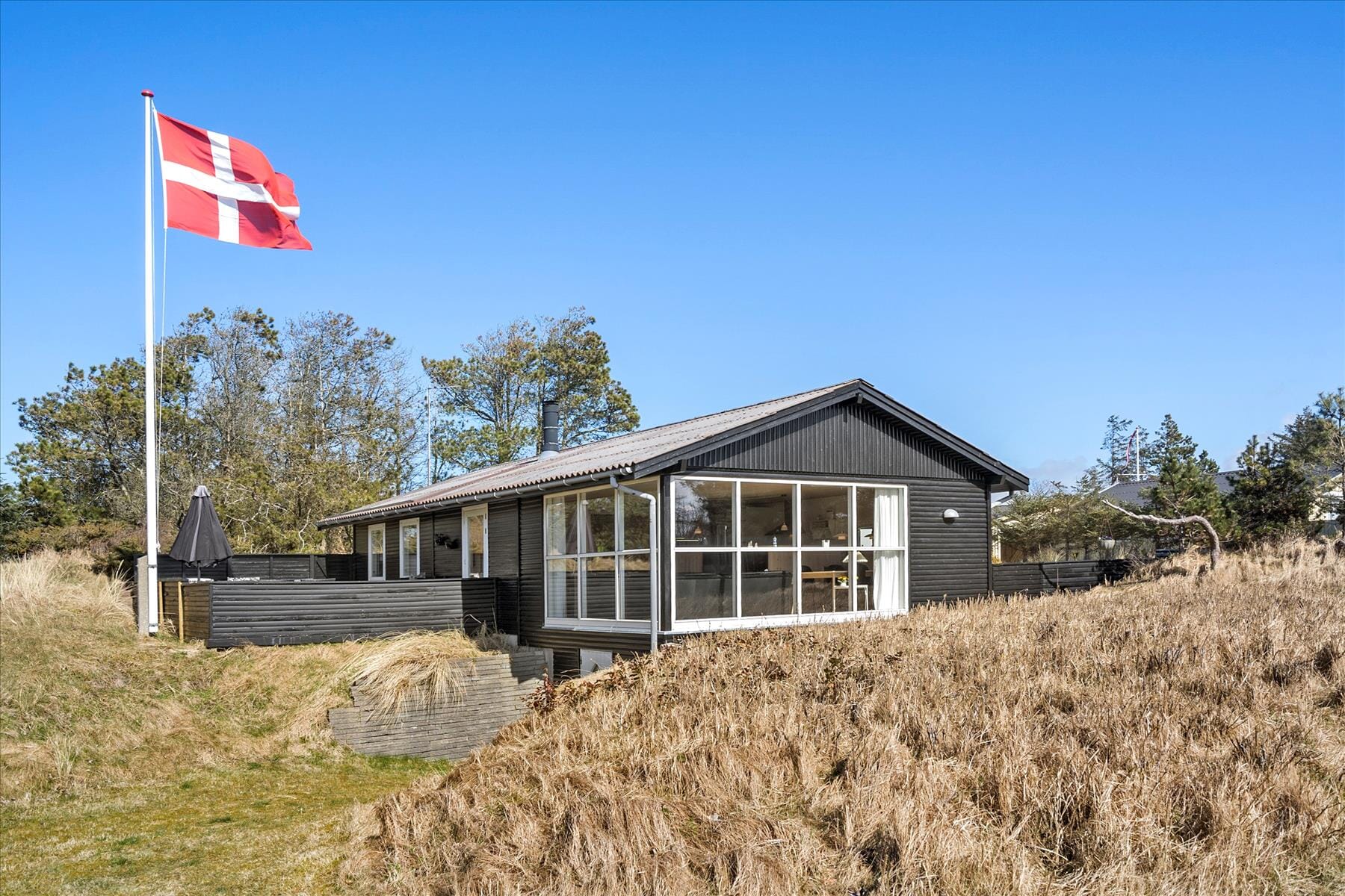 Sowohl das Ferienhaus als auch das kleine Nebengebäude präsentieren sich in schöner, klassischer Ferienhausmanier mit einer schwarz gestrichenen Holzfassade und weißen Fensterrahmen. Im Hausinneren erwartet Sie eine helle und einladende Atmosphäre, die unter anderem auf die gelungene Renovierung und Modernisierung im Jahr 2006 zurückzuführen ist. Der Küchen-, Wohn- und Essbereich wird Dank der großen Fensterpartie von einem herrlichen Tageslichteinfall erfüllt. Zudem genießen Sie einen schönen Ausblick bis hoch in den hohen, blauen Himmel. Im Wohnraum sorgt ein Fernseher mit Chromecast-Anschluss für Unterhaltung, während Sie es sich an kühleren Abenden vor dem romantisch knisternden Kaminofen gemütlich machen. Die offene Küche ist gut ausgestattet, sodass Sie ohne weiteres köstliche Urlaubsmahlzeiten kreieren können. Das Haus beherbergt darüberhinaus zwei schöne Schlafzimmer und ein Badezimmer mit einer Waschmaschine und einer Fußbodenheizung. Das Nebengebäude bietet ausreichend Platz und Schlafgelegenheiten für zwei weitere Urlaubsgäste.