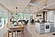 Ein Kaminofen und helle Holzpaneele an den Wänden sind einige der klassischen Besonderheiten hier in diesem Ferienhaus, welches einen vernünftigen Bauplan für fünf Personen aufweist. Der Gemütlichkeit verbreitende Kaminofen steht im Wohnzimmer, welches außerdem mit grossen Fensterpartien ausgestattet ist, die das Tageslicht ins Innere einladen und eine herrliche Aussicht auf das Naturgrundstück bieten. Als ein weiteres schönes Detail ist die offene Verbindung zur Küche, so dass, wenn Sie Essen kochen oder Geschirr abwaschen, Sie trotzdem an den gemütlichen Gesprächen der Familie Teil haben können. Der Bauplan beinhaltet im Übrigen drei Schlafzimmer sowie ein Badezimmer mit Dusche und Fußbodenheizung.