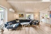 Beim Betreten des Ferienhauses wirst du sofort von einer hellen und behaglichen Einrichtung empfangen, die Gemütlichkeit ausstrahlt. Die großen Fensterfronten lassen die Natur ins Wohnzimmer strömen, und hier kannst du die Sonnenstrahlen die angenehme Atmosphäre des Raumes erhellen lassen. Das Wohnzimmer ist das Herz des Hauses, wo sich die Familie an kühlen Abenden vor dem Kamin versammeln kann, während der Duft von frisch gebrühtem Kaffee aus der geräumigen Küche strömt. Die offene Küche ist perfekt eingerichtet, sodass du die Gesellschaft deiner Liebsten auch während des Kochens genießen kannst. Das Haus bietet schöne Schlafzimmer, die ebenfalls in hellen Tönen gehalten sind und Ruhe und Entspannung ausstrahlen. Hier kannst du zu Vogelgezwitscher und frischer Luft aufwachen, was einen wunderbaren Start in den Ferientag ermöglicht.