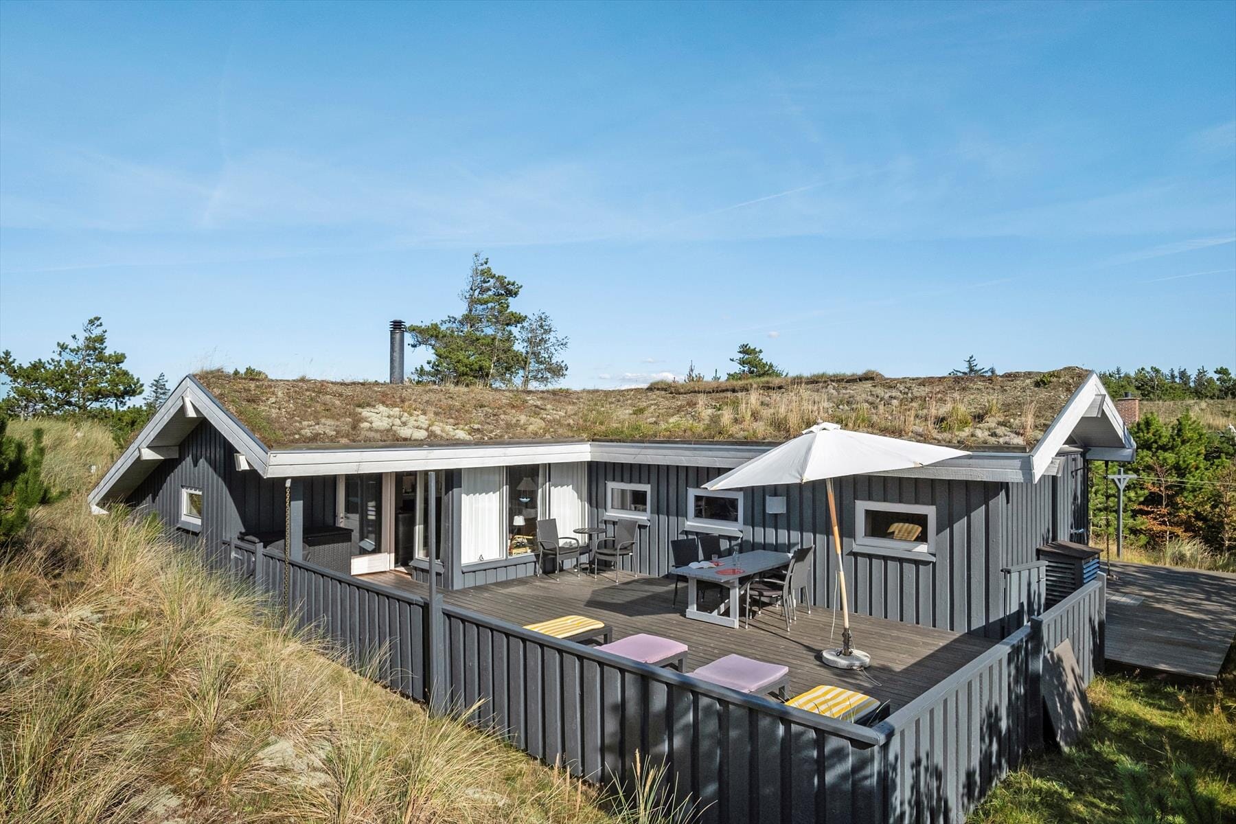 Draußen findest du die eingezäunte Terrasse, die die ideale Oase sowohl für Entspannung als auch für gemeinsames Beisammensein bietet. Der Terrassenbereich ist perfekt für sonnige Tage, und hier kannst du deinen Morgenkaffee genießen oder eine Pause im Schatten der Bäume machen. Der eingezäunte Innenhof bietet euch viel Privatsphäre, sodass ihr euch ohne Störungen entspannen könnt. Die idyllische Umgebung des Ferienhauses lädt zu langen Spaziergängen ein, bei denen ihr die vielen Wege durch den Wald und die Dünen erkunden könnt. Hier gibt es Platz für ruhige Momente sowie für aktive Erlebnisse, während ihr die einzigartige Natur in der Nähe genießt.