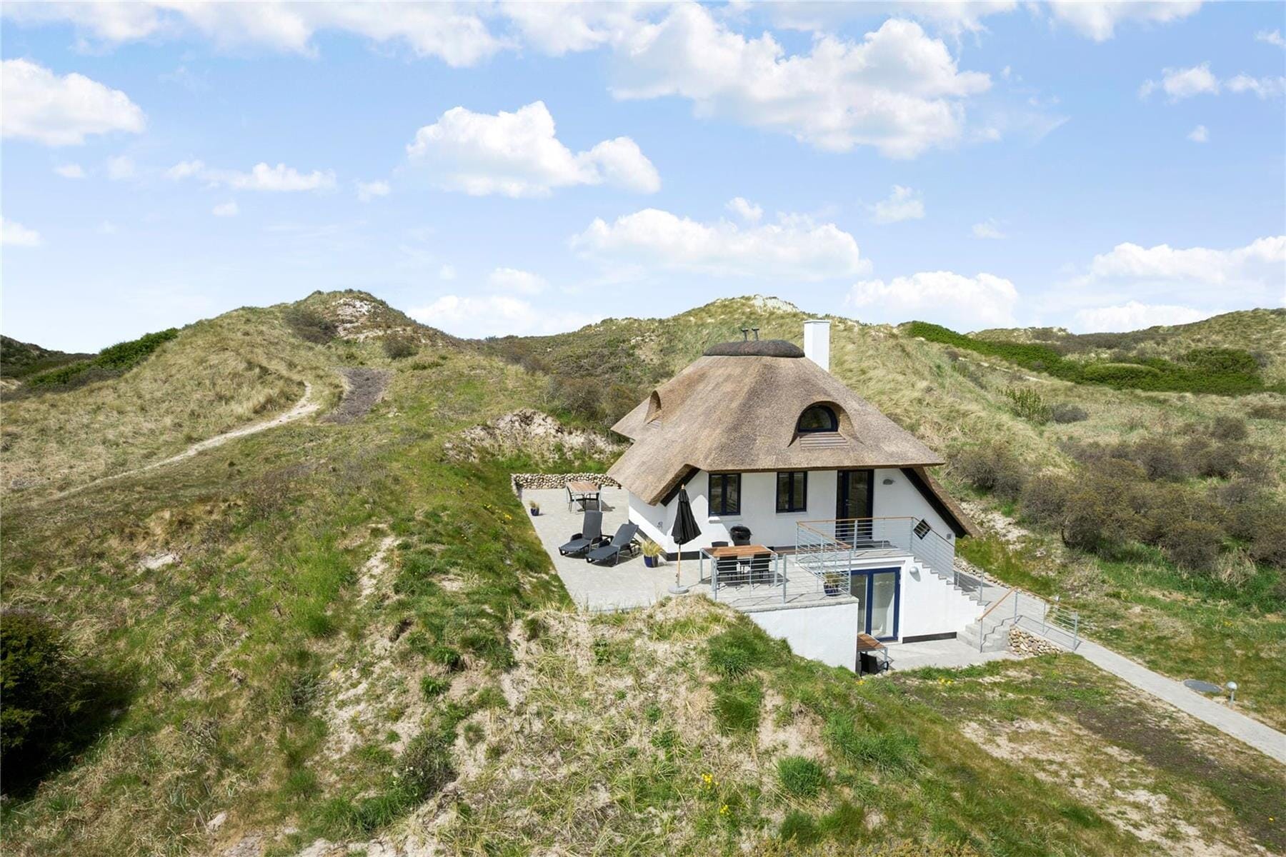 Vom Erdgeschoss und von der unteren Etage genießen Sie einen direkten Ausgang hinaus ins Freie, wo Sie bereits von mehreren Steinterrassen, die sich rund um das Haus erstrecken, erwartet werden. Da das Haus wunderbar versteckt in den Dünen liegt, verbringen Sie hier herrlich ungestörte Urlaubsstunden und genießen Dank der Dünen guten Schutz vor dem meist vorherrschenden Westwind - ein Umstand, der Ihnen bei einem Urlaub so nah an der dänischen Westküste nicht all zu oft geboten wird. Besonders die nach Osten gerichtete Terrasse verwöhnt Sie mit einer prachtvollen Aussicht auf die hügelige Landschaft. Falls Sie sich vom Blick auf die Nordsee in den Bann ziehen lassen möchten, gehen Sie einfach hinauf auf die Dünenwipfel Ihres privaten, riesigen Naturgrundstücks.