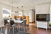 Die Atmosphäre, in dem 2017 gründlich renovierten Ferienhaus, ist hell und einladend. Im Wohnbereich, in dem Wohnzimmer und Küche offen miteinander verbunden sind, tragen der durchströmende Lichteinfall und die klassischen Ferienhauselemente, wie der Kaminofen und die helle Holzverkleidung der Wände und Decken zu einem angenehmen Raumgefühl bei. Der Grundriss des Hauses ist gut durchdacht und aufgeteilt, sodass sich sechs Personen hier wohlfühlen können. Eines der Schlafzimmer ist mit einem Doppelbett ausgestattet, während das zweite Schlafzimmer sowohl mit einem Doppelbett als auch mit einem Etagenbett eingerichtet ist – außerdem gibt es auf dem Schlafboden noch Matratzen, sodass Sie sich gut aufteilen können. Hier hört man auch das Meer. Weiterhin gibt es ein Badezimmer, das modern und funktionell mit einer Duschnische, Waschbecken und Fußbodenheizung ausgestattet ist.