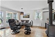 Tritt ein in ein helles und einladendes Wohnzimmer, in dem große Fenster das Sonnenlicht hereinlassen und einen Blick auf die umliegende Natur bieten. Der zentrale Kaminofen schafft eine gemütliche Atmosphäre, ideal für lange Abende mit Brettspielen oder einem guten Buch. Der offene Küchenbereich ist sowohl funktional als auch freundlich eingerichtet, was das gemeinsame Kochen und Essen erleichtert. Hier gibt es Platz für kleine und große Momente zusammen.