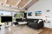 Beim Betreten des Ferienhauses wirst du von einem hellen und einladenden Wohnzimmer mit hohen Decken und großen Fenstern begrüßt, die die Natur ins Haus holen. Der Kaminofen sorgt für eine gemütliche Atmosphäre, und die komfortablen Möbel laden zum Entspannen ein. Die offene Küche ermöglicht es, dass alle beim Kochen mithelfen können, um Mahlzeiten in der gemütlichen Essecke zu genießen. Wenn du Entspannung suchst, kannst du ein langes, heißes Bad im schönen Badezimmer mit Whirlpool und Sauna nehmen, was dir ein zusätzliches luxuriöses Ferienerlebnis bietet.