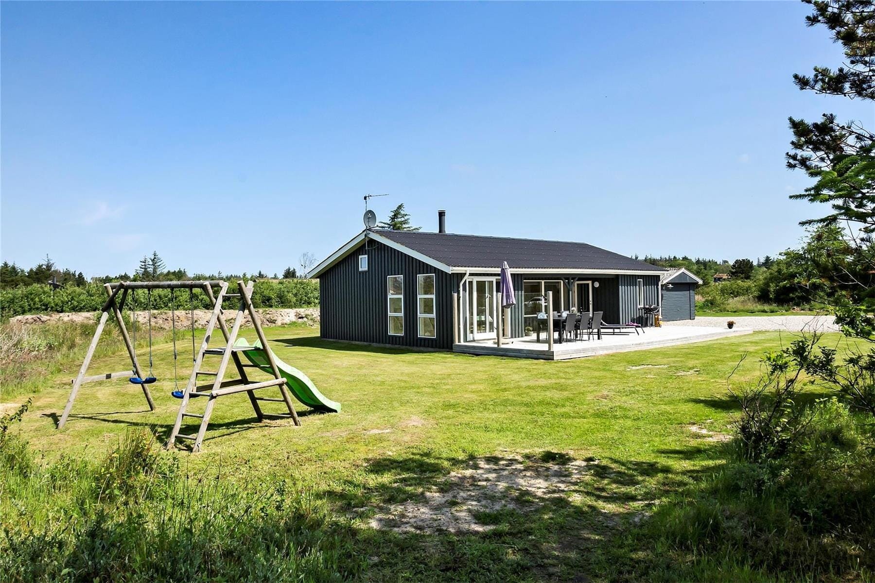 Vom Wohnzimmer und der Küche aus gelangt man auf die Terrasse, die angenehm abgeschirmt ist und einen schönen Blick auf den Garten bietet, der mit einer Schaukel und einem Sandkasten ausgestattet ist. Das Ferienhaus liegt in einer ruhigen Ferienhaussiedlung und ist ideal für alle, die sich etwas mehr Platz zum Spielen und Entspannen wünschen.