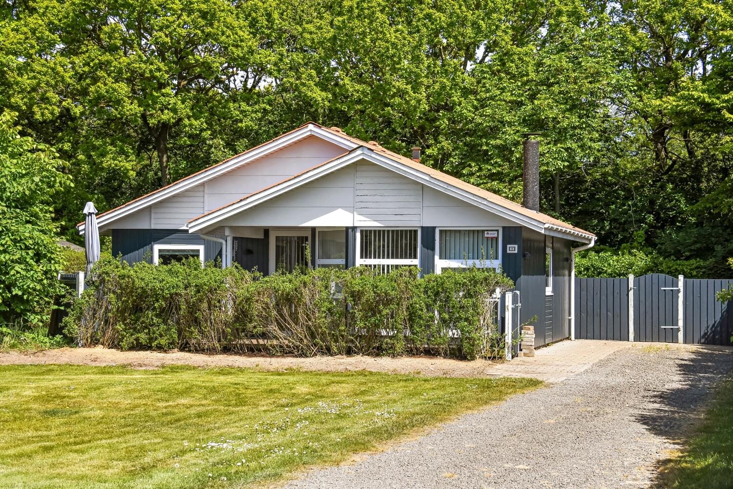 Sowohl vor als auch hinter dem Haus gibt es jeweils eine Holzterrasse. Dadurch genießen Sie die Wahl zwischen mehreren schönen Aufenthaltsplätzen, auf denen Sie sich wunderbar unter freiem Himmel erholen und entspannen können. Dank der Holzumrandung und einer Hecke sind Sie auf den Terrassen ungestört und gut vor Wind geschützt. Gartenmöbel, Liegestühle, ein Sonnenschirm und ein Grill stehen selbstverständlich zu Ihrer Verfügung. Zudem gibt es eine Rasenfläche auf dem kleinen Grundstück neben der Einfahrt, wo man das Auto parken kann.