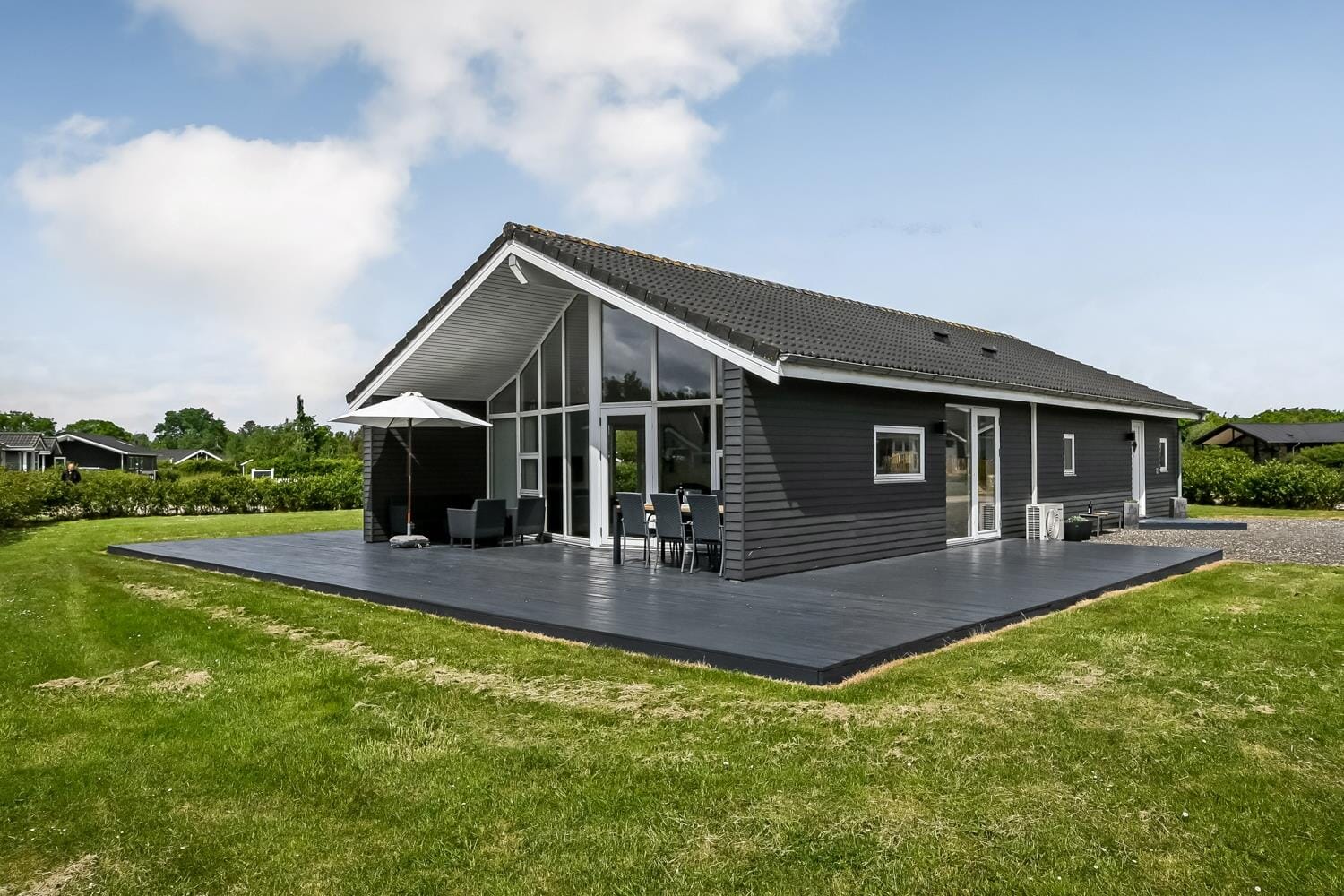 Das Leben im Freien entfaltet sich auf der schönen Terrasse, die direkt an das Wohnzimmer anschließt. Hier kannst du dich mit einer Tasse Kaffee im Gartenstuhl zurücklehnen, dem Vogelgezwitscher lauschen und den Duft von frisch gemähtem Gras genießen. Das grüne Grundstück bietet viel Raum für Spiel und Erholung, und dank der ruhigen Lage kannst du einfach mal die Schultern sinken lassen und das entspannte Tempo genießen. Die Terrasse lädt zu langen Mahlzeiten unter freiem Himmel und zu gemütlichen Abenden in den letzten Sonnenstrahlen ein – vielleicht mit dem Grill an und einer Decke über den Beinen, wenn der Tau fällt. Hier bekommst du das Gefühl, dein eigenes kleines Refugium mitten im westjütländischen Sommerland zu haben.