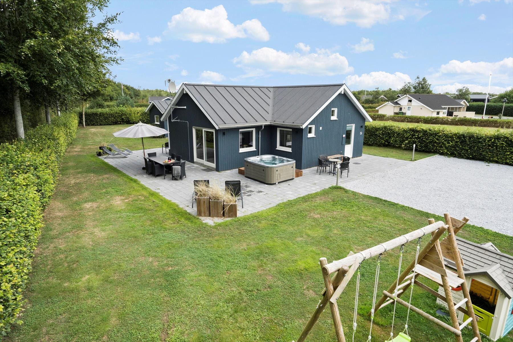 Das umkränzte Ferienhausgrundstück ist groß und wird von einer Buchenhecke abgeschirmt. Sie wohnen angenehm zurückgezogen am Ende einer Sackgasse. Die Grasfläche wird Ihre Kinder mit Sicherheit zum Umhertollen und zum Ballspielen animieren. Währenddessen können Sie es sich auf der großen Terrasse so richtig gemütlich machen. Die Terrasse eignet sich ganz hervorragend für ausgedehnte Sonnenbäder, erholsame Stunden mit einem spannenden Buch oder auch für gemütliche und gesellige Runden am Abend mit einem köstlichen Essen vom Grill. Dank der vorhandenen Liegestühle und des Outdoor-Whirlpools, der sehr schön auf der Terrasse platziert ist, dürfen Sie sich auf herrliche Momente voller Wellnessflair freuen.