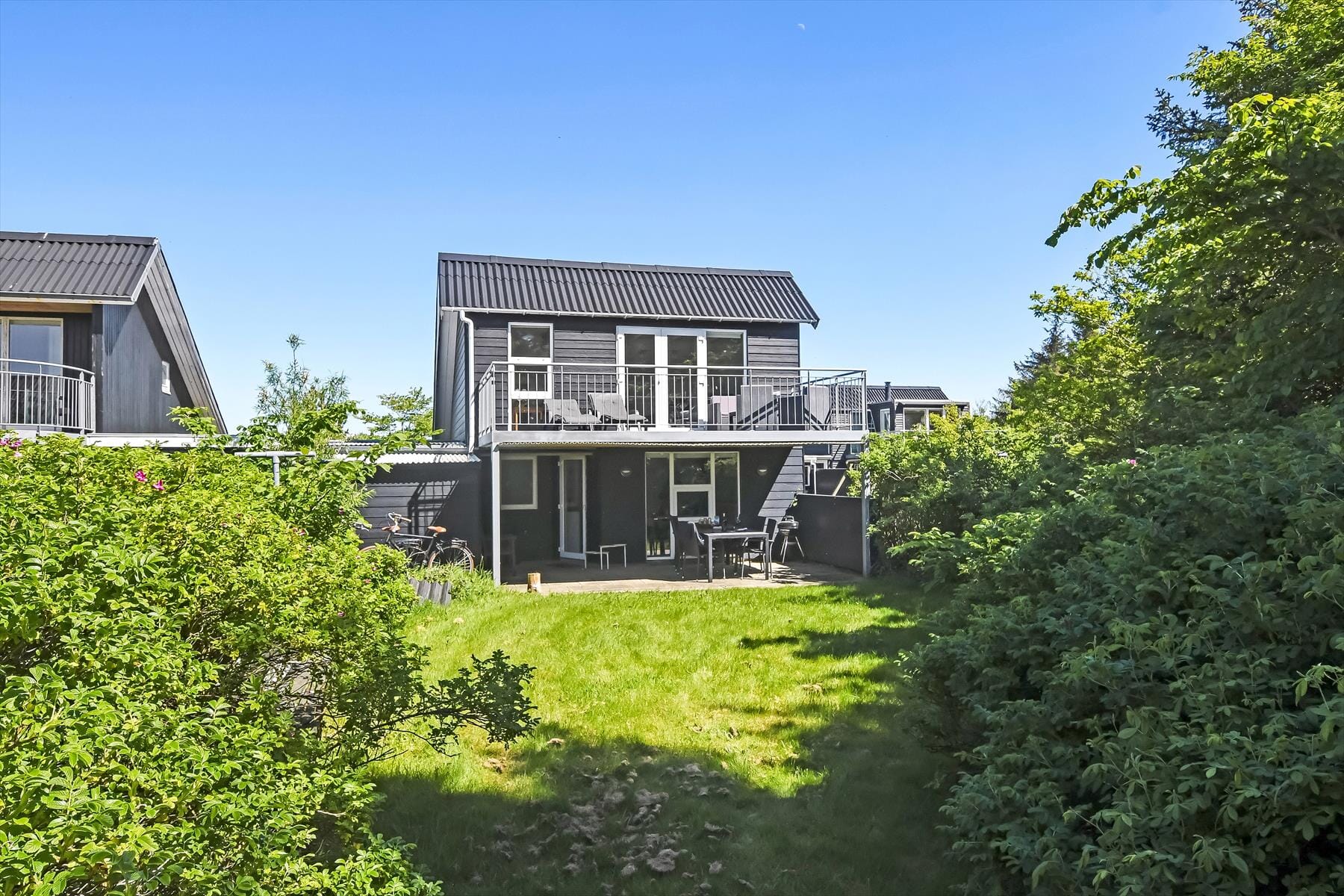 Hell eingerichtetes Ferienhaushaus mit grünem Garten und Fjordblick vom Balkon aus
