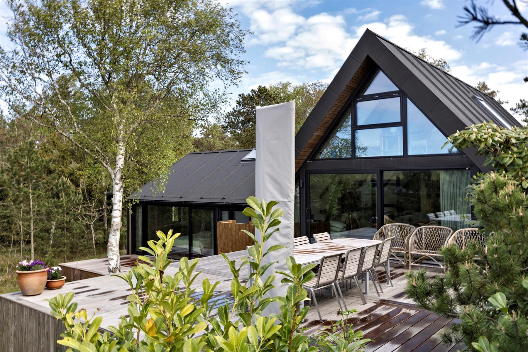 Wenn du das Haus betrittst, empfängt dich ein einladendes, geschmackvolles Zuhause mit liebevollen Details. In der Wohnküche wurden die alten Holzbalken erhalten, die dem Raum seinen besonderen Charakter verleihen. Die sanften, pudrigen Farbtöne in den Fluren und Schlafzimmern harmonieren wunderbar miteinander und stehen im schönen Kontrast zu den massiven Eichenholzdielen. Durch die clevere Aufteilung auf drei Ebenen sowie Dachfenster, schräge Fenster und Deckenfenster wird das gesamte Haus von morgens bis abends mit natürlichem Licht durchflutet. Die neue Küche (inkl. Geschirrspüler) bietet alles, was du brauchst, und grenzt an einen gemütlichen Essbereich. Von hier aus gelangst du direkt auf die nordöstlich gelegene Terrasse mit Blick in den Wald – mit etwas Glück kannst du hier Eichhörnchen beobachten oder ein Reh entdecken. Das Wohnzimmer ist hell und offen gestaltet, mit großen Fenstern und Zugang zu einer weiteren südlich ausgerichteten Terrasse – perfekt, um den Vögeln zu lauschen oder den Kindern beim Spielen auf dem Naturgrundstück zuzusehen. Das Haus verfügt über drei Schlafzimmer mit Doppelbetten und bietet Platz für sechs Erwachsene und ein Kind. Im Obergeschoss erwartet dich eine gemütliche Leseecke mit Panoramablick – ideal zum Entspannen mit einem guten Buch. Das geräumige Badezimmer ist mit Dusche, Waschmaschine und Trockner ausgestattet – und von hier aus gelangst du direkt auf eine weitere Südterrasse mit Außendusche. Ideal für eine erfrischende Dusche nach dem Strandbesuch!