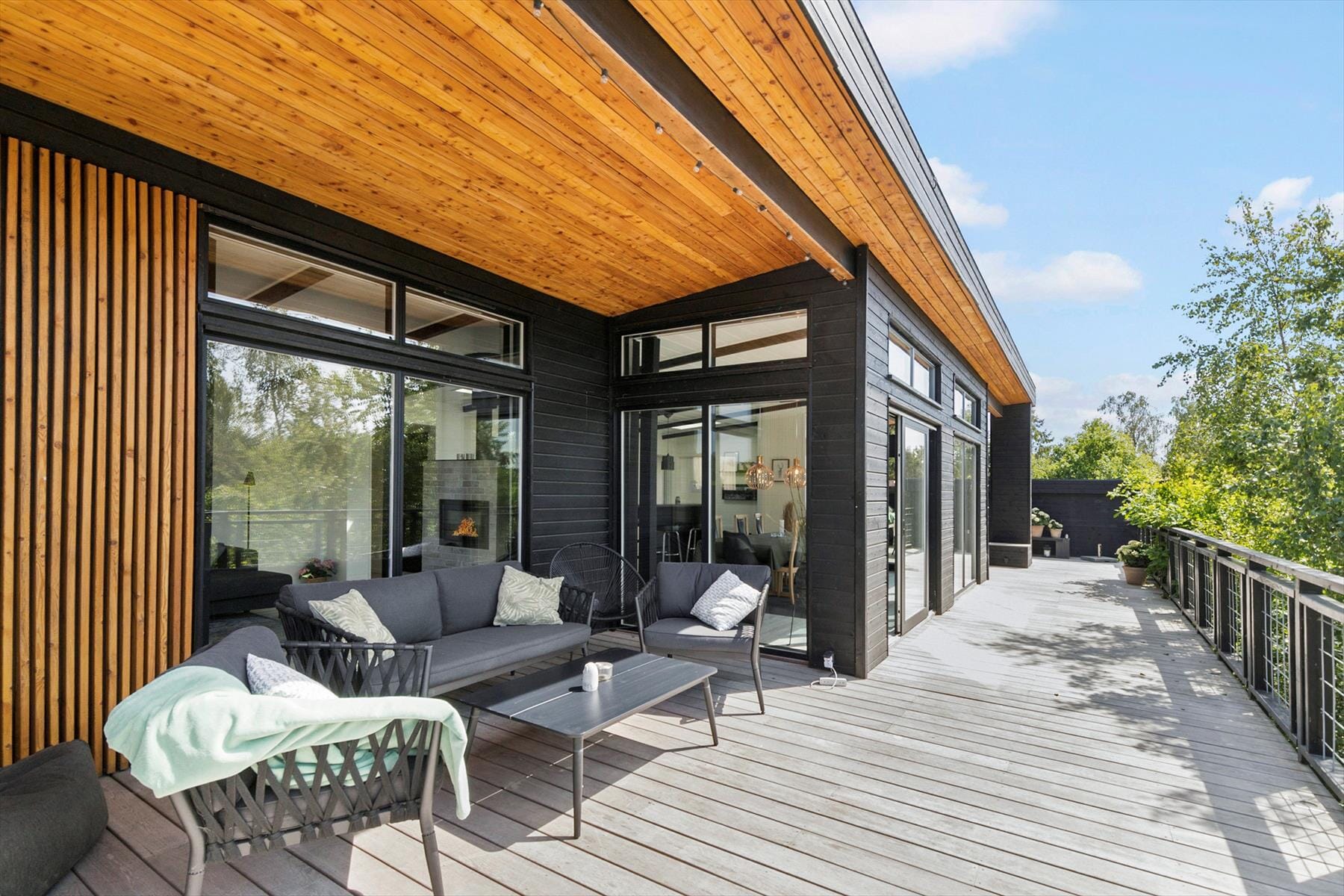 Das Haus verfügt über eine große, uneinsehbare Holzterrasse, die sich perfekt eignet für entspannte Stunden in der Sonne oder gemütliche Grillabende. Die Terrasse umgibt das Haus, sodass du immer einen Platz im Windschatten oder in der Sonne findest. Hier stehen dir hochwertige Gartenmöbel und ein Gasgrill zur Verfügung, die zum Leben im Freien einladen. Das Grundstück ist eingezäunt, was es ideal für kleine Kinder und Hunde macht. Statt eines klassischen Gartens bist du von Natur umgeben, die einen ruhigen Rahmen bietet für deinen Aufenthalt.