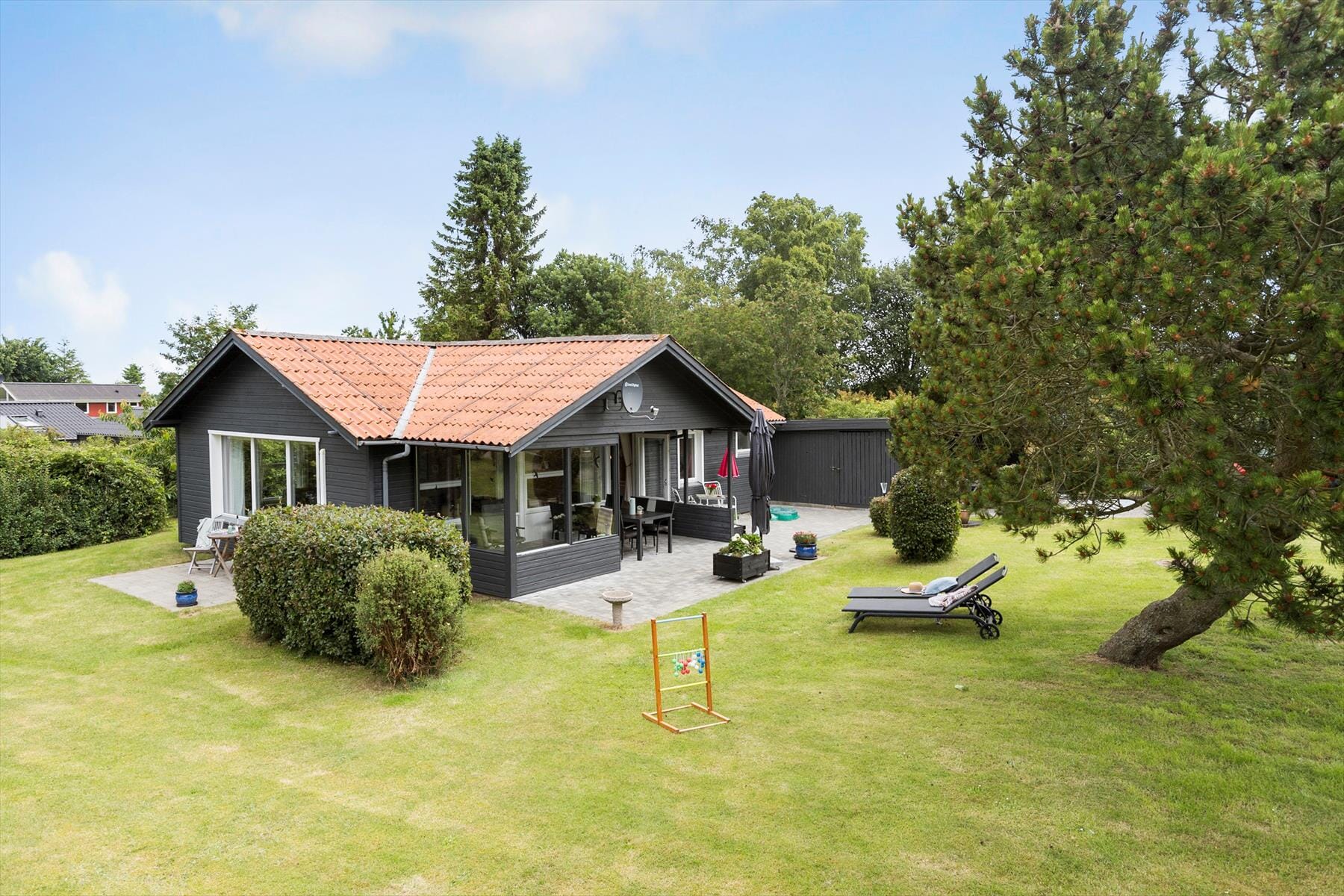 Der große Garten ist eine wahre Oase mit grünem Gras rund um das Haus. Es gibt viele Möglichkeiten zum Spielen und Entspannen. Kinder können sich in den vielen Ecken im Garten verstecken. Für die Erwachsenen gibt es mehrere gemütliche Liegeflächen und eine schöne überdachte Terrasse, auf der du einen ruhigen Morgenkaffee oder einen warmen Sommerabend mit einem Grill und guten Gesprächen genießen kannst.
