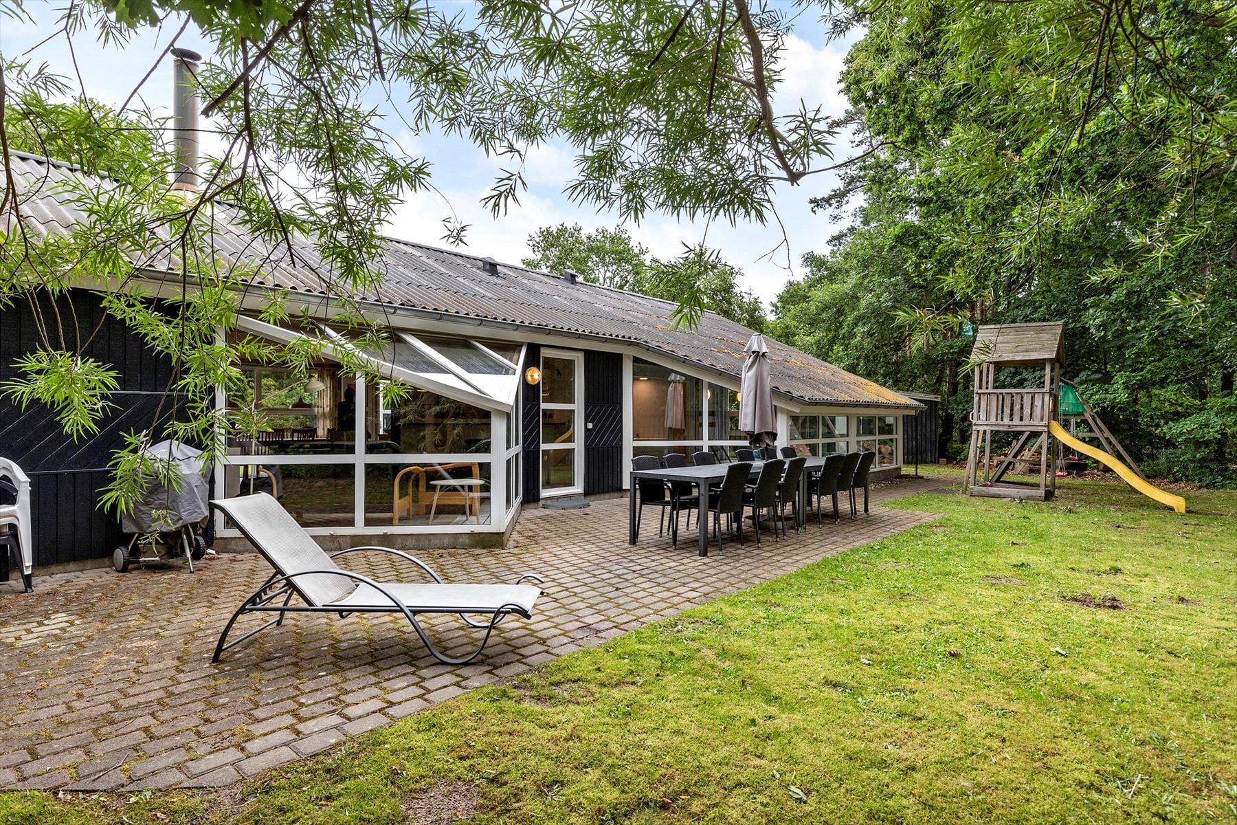 Dein Ferienhaus befindet sich auf einem schönen Grundstück mit einer Grasfläche und einer Steinterrasse, die nahezu das gesamte Haus umgibt. Hohe Bäume sorgen für Schutz und eine friedvolle Atmosphäre. Deine Kinder dürfen sich auf ein Gartentrampolin sowie auf einen Kletterturm mit Schaukeln und einer Rutsche freuen. An beiden Seiten des Hauses laden Gartenmöbel zum Erholen und Entspannen ein. Lange Urlaubstage werdet ihr gerne mit einem köstlichen Abendessen vom hauseigenen Grill ausklingen lassen.