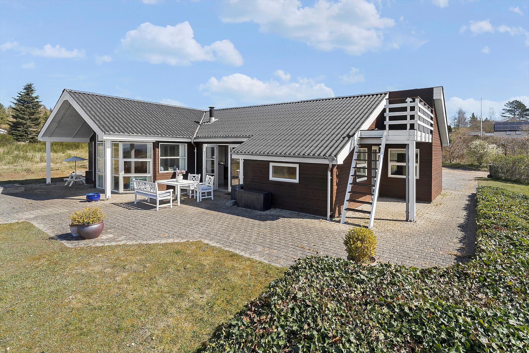 Vom Wohnraum aus trittst du direkt auf die große, gepflasterte Terrasse, die das gesamte Haus umgibt. Hier bieten sich dir beste Entspannungsmöglichkeiten an der frischen Luft. Die Terrasse lädt zu langen Sommerabenden mit einem Essen vom Grill und einem guten Glas Wein ein. Während ihr euch entspannt zurücklehnt, genießt ihr den Ausblick über das hübsche Terrain und auf die Bucht von Ebeltoft. Der Garten erweist sich als wahres Paradies für Kinder. Die Sandkiste und das Spielhaus versprechen zusammen mit der Rasenfläche jede Menge Spaß und Abwechslung. Die Westseite der Terrasse eignet sich hervorragend zum Genießen der letzten Sonnenstrahlen des Tages. Auf ihr genießt ihr die wunderbare Ruhe und die fantastische Natur, die das Urlaubsdomizil umgibt.