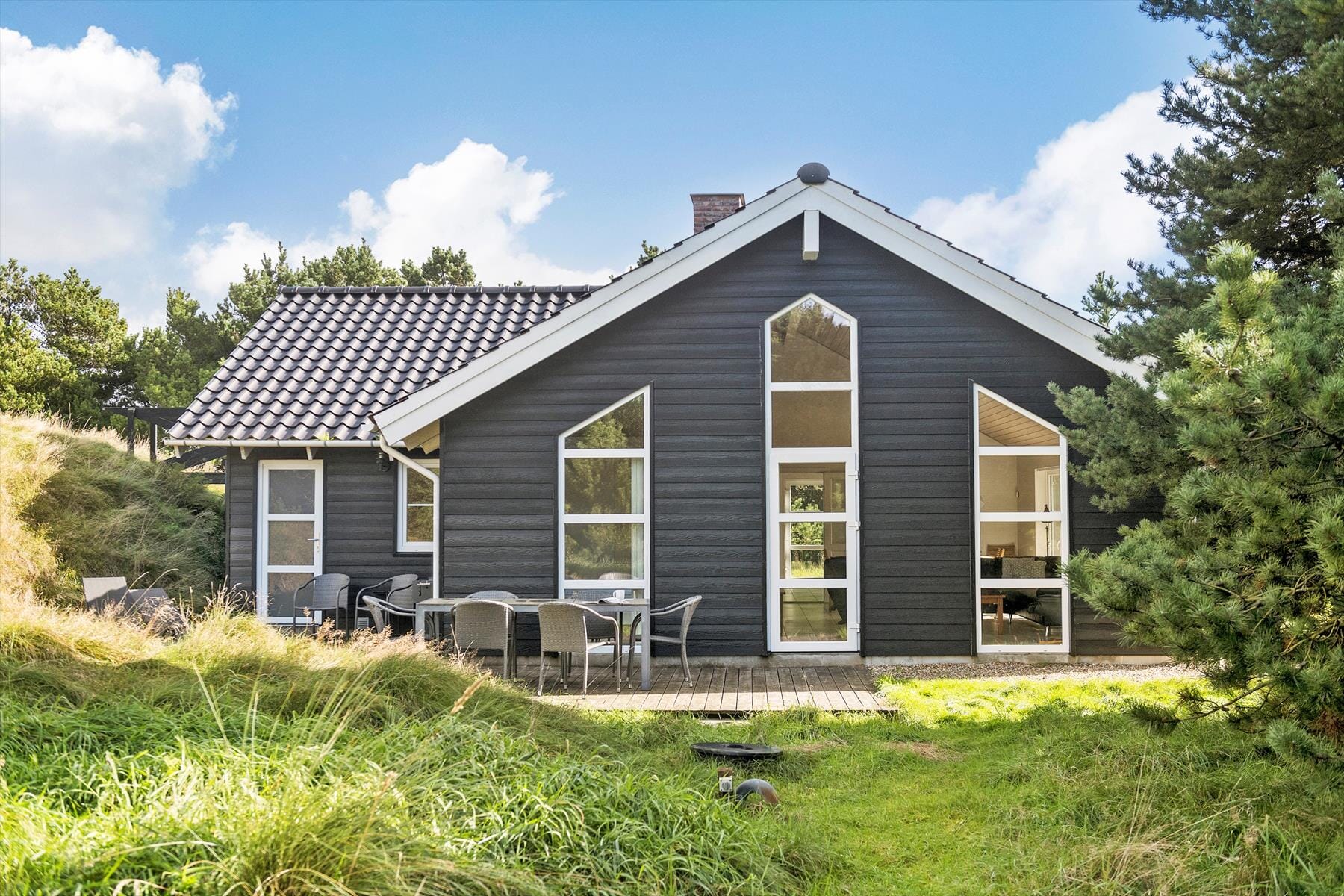 Um das Ferienhaus herum gibt es eine schöne Holzterrasse und andere gemütliche Ecken, von denen aus du die herrliche Aussicht auf die Pinien des Naturgrundstücks genießen kannst. Aber der eigentliche Höhepunkt ist die Düne hinter dem Haus. Von dort aus hast du einen herrlichen Blick auf die Landschaft, mit Blick auf die flachen Felder und die Pferdekoppeln des Fanø Reitclubs. Hier kannst du unter der Sonne entspannen und die Natur genießen, während du vielleicht eine Tasse Kaffee trinkst oder mit der Familie zu Mittag isst.