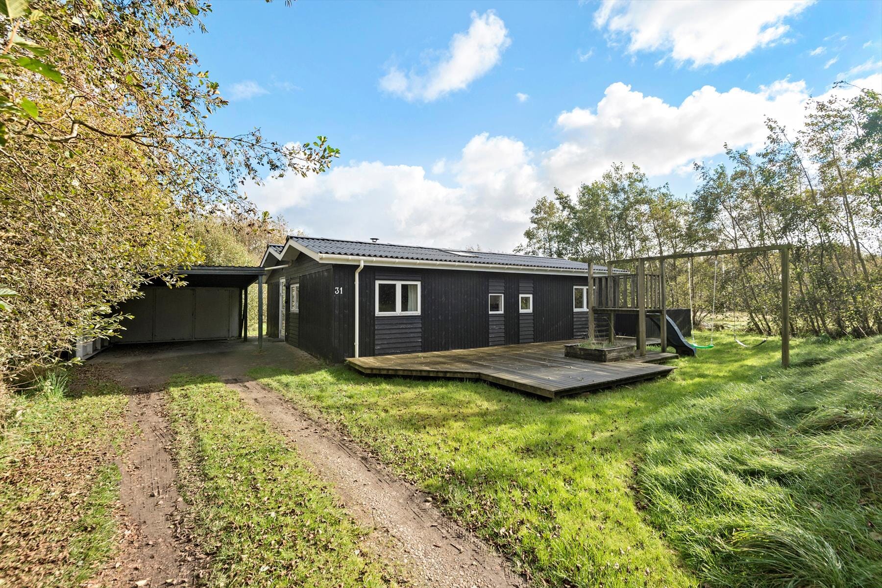 Das Naturgrundstück ist mit seinen 2700 m² wunderbar groß und bietet eine abgeschiedene Oase mit dichter Randbepflanzung und Rasenfläche. Die Tierwelt ist reichhaltig in der Gegend, so dass du vielleicht einen Hirsch, ein Kaninchen oder sogar einen Fasan vorbeihuschen siehst, während du drinnen mit einer Tasse Kaffee sitzt – aber wenn du und deine Familie draußen seid, habt ihr das ganze Paradies sicher für euch allein. Für die Kinder gibt es einen Sandkasten und einen Spielturm mit Schaukeln und Rutsche, und wenn ihr Lust auf Gartenspiele habt, könnt ihr einfach loslegen. Nehmt euch aber auch genügend Zeit zum Entspannen, Sonnenbaden und Grillen auf der schönen Terrasse, die sich um das Haus erstreckt. Hier gibt es sowohl geschlossene, überdachte als auch völlig offene Aufenthaltsbereiche, so dass du je nach Stimmung den perfekten Platz finden kannst.