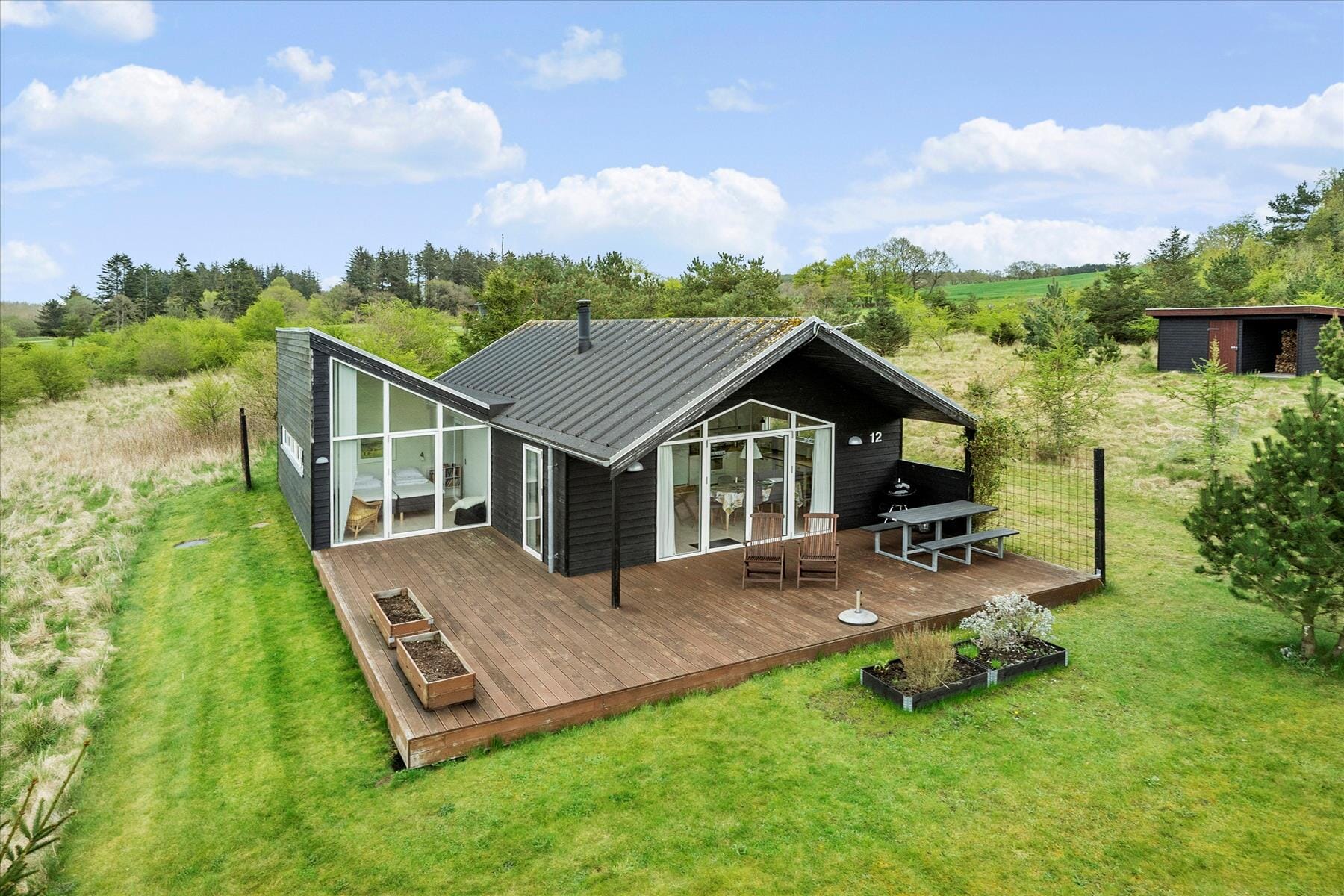 Der Wohnraum und zwei Schlafräume verwöhnen mit einem direkten Ausgang auf schöne Terrassen. An die Ostseite des Hauses schließt sich eine kleine Terrasse, nach Westen und somit in Richtung Küste erstreckt sich eine große, teilweise überdachte Terrasse. Das 1.399 m² große Naturgrundstück ist ruhig und schön und glänzt mit Panoramaaussicht über die grüne Landschaft. Von Ihrer eigenen, friedvollen Oase sehen Sie den Hjarbæk Fjord und den örtlichen Golfplatz.