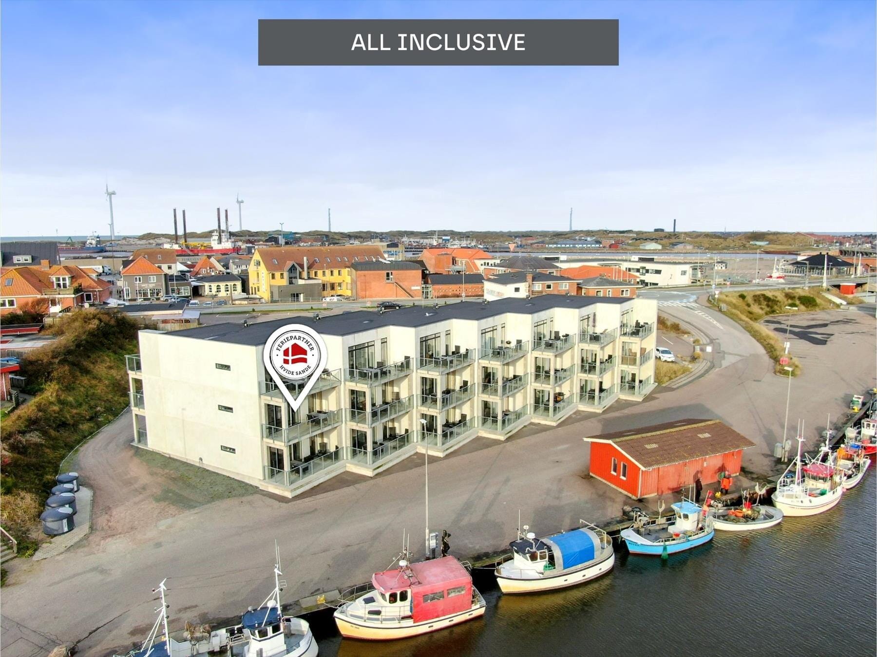 Hinter dem Wohnkomplex stehen Ihnen Parkmöglichkeiten zur Verfügung. Nur wenige Schritte trennen Sie von der Kaimauer und dem Hafenbecken, in dem schaukelnde Fischerboote vertäut sind. Durch die Platzierung eröffnen sich Ihnen einzigartige Einblicke in das Leben der Fischer Hvide Sandes. Beachten Sie bitte, dass damit hin und wieder auch lautere Geräusche verbunden sein können. Im schnell zu Fuß erreichbaren Ortskern können Sie sehr gut fangfrischen und geräucherten Fisch kaufen, durch schöne Geschäfte bummeln und sich in einer der guten Lokalitäten kulinarisch verwöhnen lassen. Ein rund zehnminütiger Spaziergang trennt Sie von der Nordsee und deren wunderbarem Sandstrand. Wassersportler und Angler dürfen sich auf beste Bedingungen an Fjord und Nordsee freuen. Falls Sie sich selber einmal im Surfen oder auf Wasserskiern versuchen möchten, sollten Sie einen entsprechenden Anfängerkurs an einem der guten Surfspots oder bei der örtlichen Wasserskianlage belegen.
