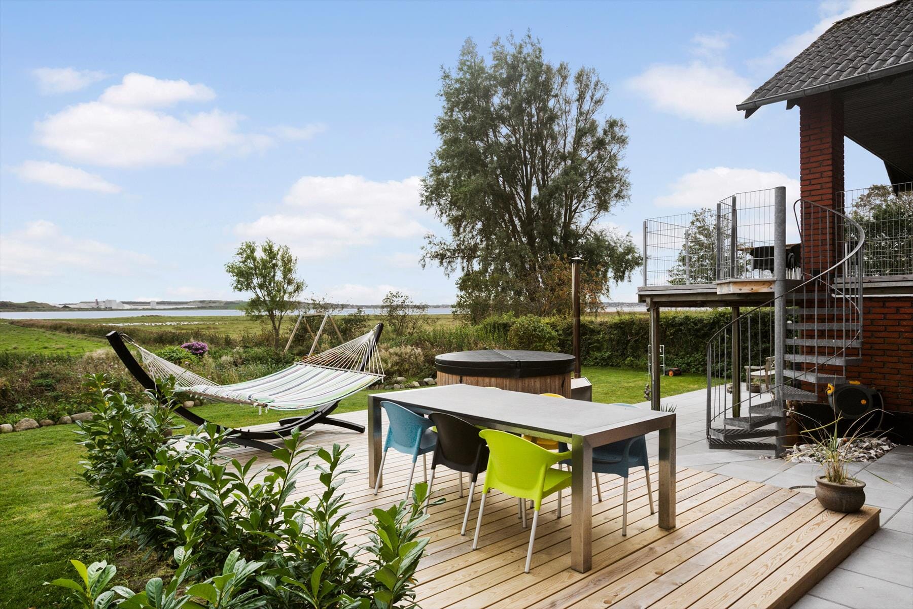 Das Außenbereich dieses Fe­ri­en­hau­ses ist ein wahres Juwel, wo Sie inmitten der idyl­li­s­chen Natur entspan­nen können. Die großzügigen Terrassen laden dazu ein, den Mor­genkaf­fee zu genießen, während die Sonne über dem Fjord aufgeht, und den Tag mit einem schönen Son­ne­nun­ter­gang in bester Ge­sells­chaft zu beenden. Das luxuriöse Wild­nis­bad ist ein be­son­de­res Highlight, in dem Sie im warmen Wasser entspan­nen können, während Ihr Blick über die ruhigen Gewässer des Limfjords schweift.