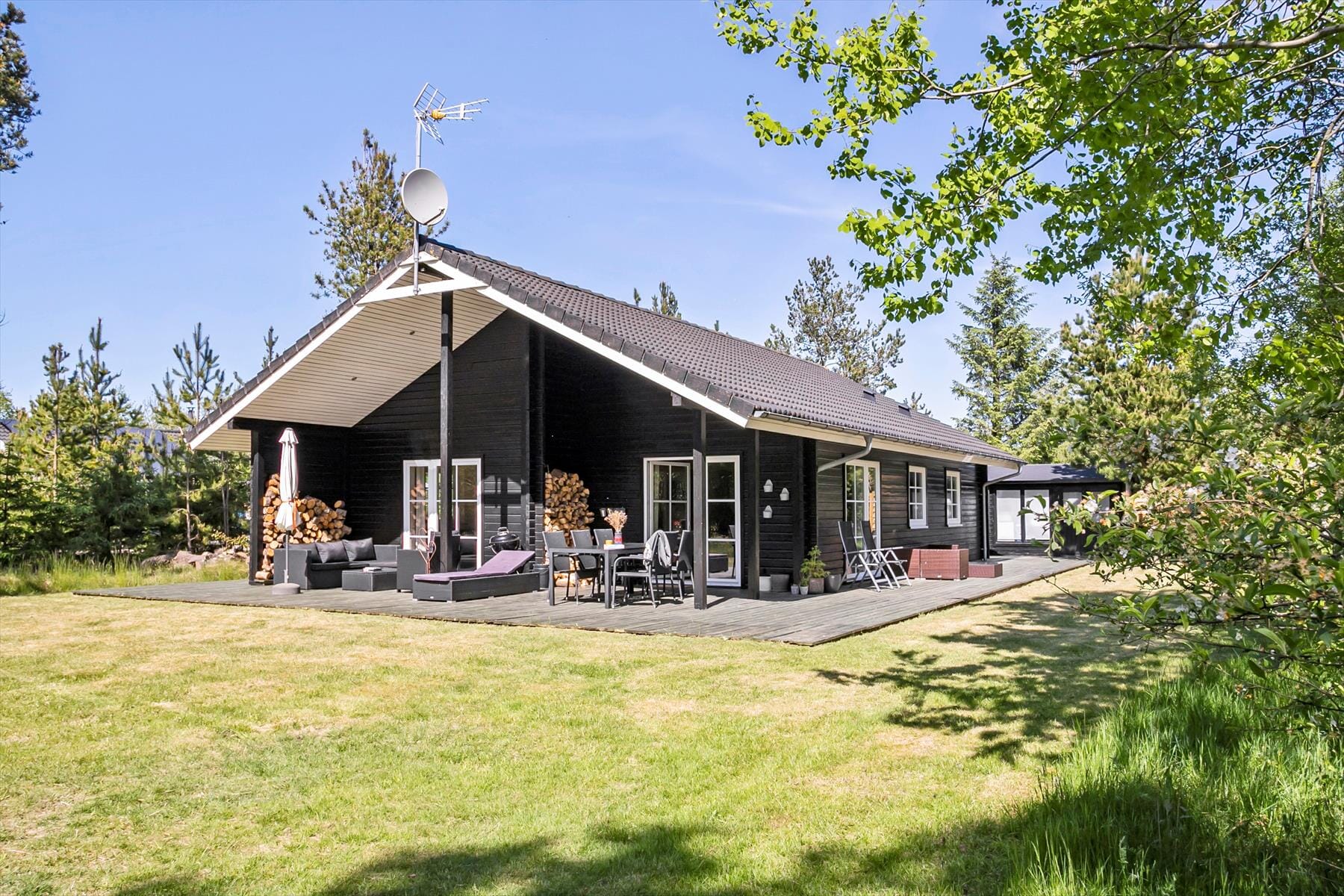 Ein großes, tolles Terrassenareal umgibt drei Seiten des Ferienhauses. Während Sie sich auf der Ost- und der Südterrasse gänzlich unter offenem Himmel aufhalten, bietet die Westterrasse mit ihrer Überdachung angenehmen Schatten. Sie bietet sich zudem sehr schön als Aufenthaltsplatz während der langen Sommerabende an. Die Grasfläche animiert zum Spielen und zum Umhertollen. Die Außenbereiche sind hübsch von hohen Bäumen eingerahmt.