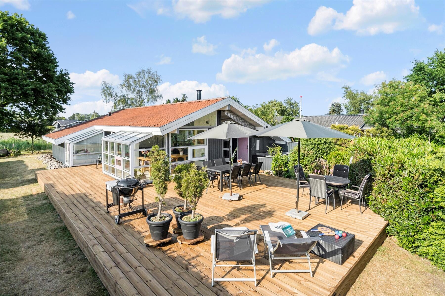 Schönes Ferienhaus mit großer Holzterrasse und Aktivitätsraum mit eigenem Heimkino - nahe dem Hafen und dem schönen Sandstrand in Juelsminde