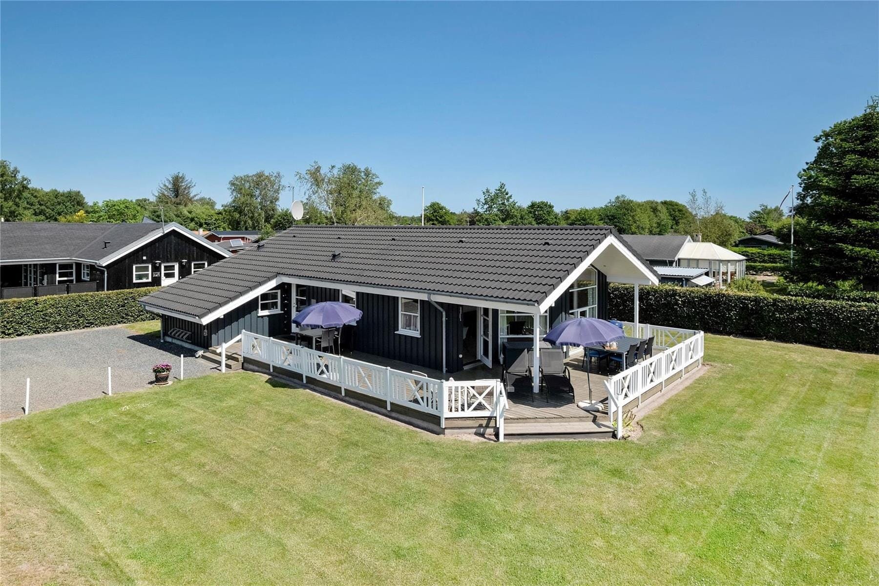 Die große, teilweise überdachte, Terrasse lädt ein zum gemeinsamen Frühstück mit der ganzen Familie, während draußen die Vögel zwitschern. Ebenfalls ein beliebter Ort zum Sonnen und Grillen. Während die Grillkohle auf die richtige Temperatur gebracht wird und der Rotwein auf dem Terrassentisch bereit steht, können die Kinder sich in dem gemütlichen Garten austoben. Hier wohnen Sie ruhig und weit genug entfernt von der nächsten Hauptstraße, nur mit Ausnahme des Rasenmähers in der Ferne und dem Summen der Bienen, werden Sie vom Lärm in Ihrer Urlaubsidylle gestört.