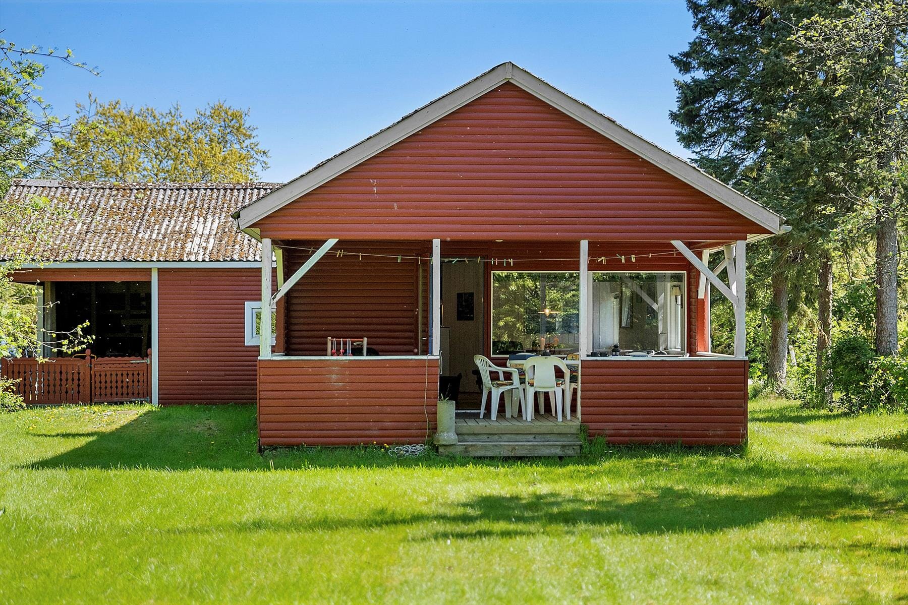Draußen setzt sich die Ferienhausatmosphäre fort. Die überdachte Terrasse ist der perfekte Ort, um den Tag mit einer Tasse Kaffee zu beginnen, während die Morgensonne Ihre Nase wärmt und die Vögel im Hintergrund zwitschern. Hier kann man lange sitzen - sowohl wenn die Sonne hoch steht als auch wenn der Tau fällt - denn die Dachkonstruktion bietet Schutz, wenn das Wetter sich verschlechtert. Auf dem Gelände gibt es viel Platz zum Spielen und Entspannen, und die Kinder können frei herumlaufen, während die Erwachsenen in aller Ruhe ein gutes Buch lesen oder ein Grillabendessen vorbereiten. Wenn die Dunkelheit hereinbricht und die Glut des Grills noch warm ist, ist dies der perfekte Ort, um den Tag mit einem Snack und einem Urlaubsgespräch unter freiem Himmel ausklingen zu lassen. Hier ist es einfach, sich dem Urlaubsspaß hinzugeben.