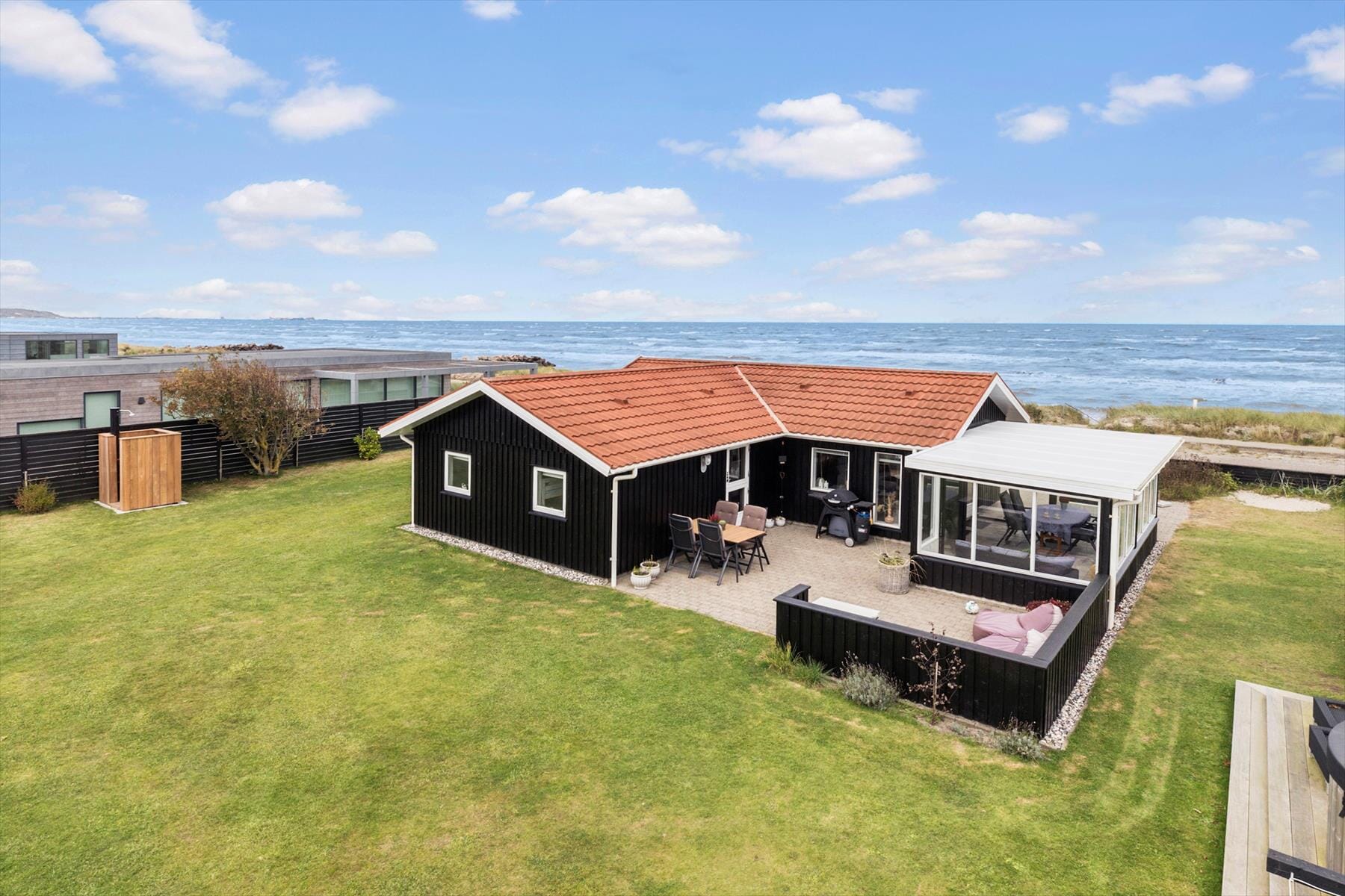Zweifellos entfaltet sich das Urlaubsleben am besten im Freien. Das Ferienhaus verfügt über eine große Terrasse mit fast direktem Zugang zum Strand, so dass Sie morgens problemlos ein Bad im Kattegat nehmen können. Wenn Sie zurückkommen, können Sie das Salzwasser in der Außendusche abspülen, bevor Sie sich im Wildnisbad entspannen, wo Sie sowohl die Aussicht auf das Meer als auch den Himmel über sich genießen können. Die Terrasse ist der perfekte Ort, um das Abendessen zu grillen und die schönen Sonnenuntergänge mit Ihren Liebsten zu genießen. Mit mehreren Sitzgelegenheiten im Freien finden Sie immer ein geschütztes Plätzchen, und wenn Sie etwas Schatten brauchen, können Sie sich in den gemütlichen Wintergarten zurückziehen und weiter entspannen.