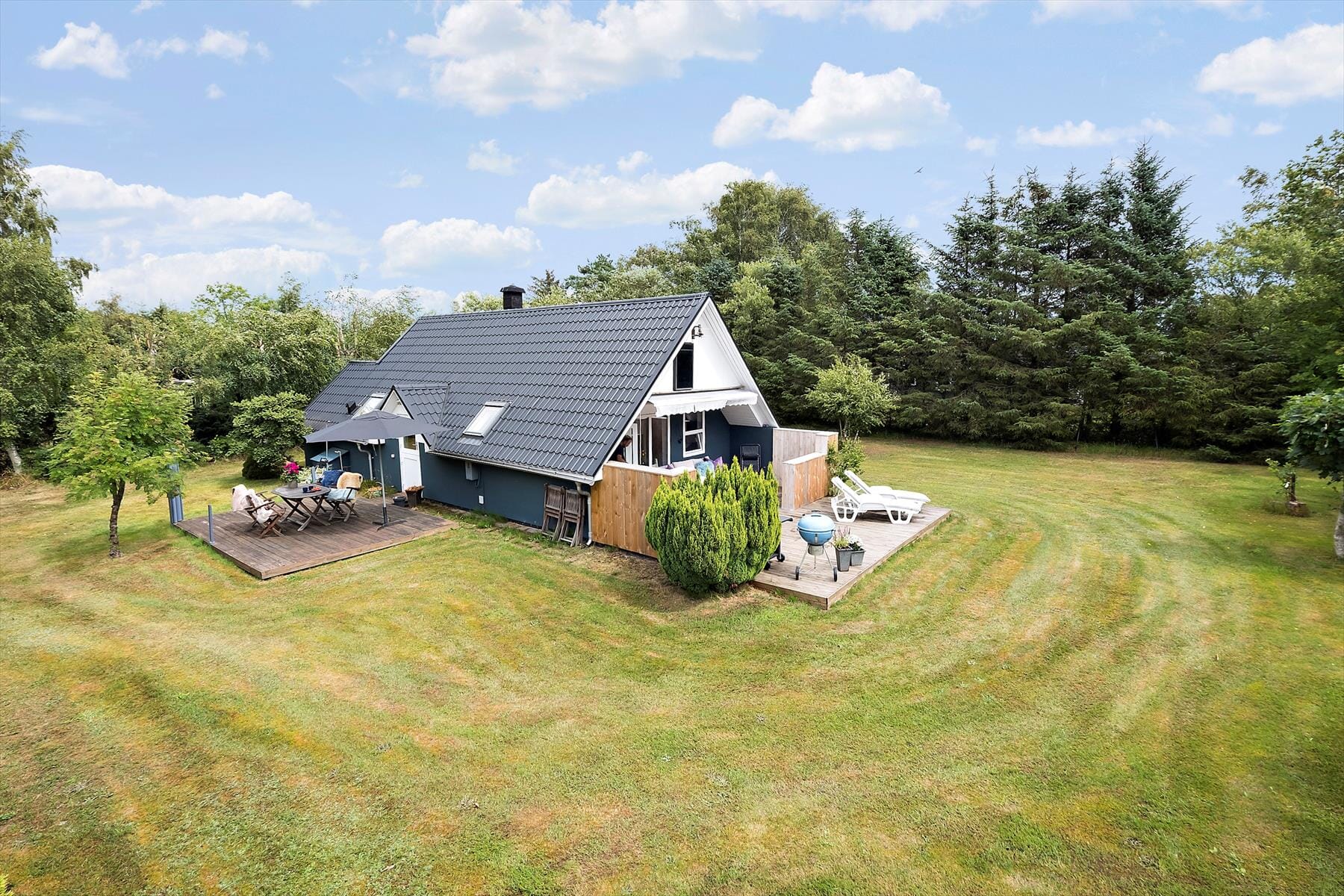Vom Aufenthaltsraum gelangen Sie hinaus auf zwei Holzterrassen. Die eine Terrasse weist gen Süden, ist teilweise abgeschirmt und mit einer Markise versehen. Die nach Westen gerichtete Terrasse verfügt hingegen über einen ausziehbaren Windschutz. Nach erholsamen Momenten auf den Gartenmöbeln lädt die weitläufige Grasfläche zum Ballspielen und zu anderen gemeinsamen Outdoor-Aktivitäten ein. Für Ihre Kinder steht auf dem 1.249 m² großen Grundstück ein Trampolin bereit.