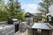 Obwohl die Küche des Hauses gut ausgestattet ist, werden Sie einen Großteil Ihrer Urlaubsmahlzeiten gern im Freien zubereiten, wo Sie eine gute Außenküche mit einem integrierten Grill erwartet. Ihre fertigen Grillgerichte servieren Sie am direkt daneben platzierten Esstisch oder an einem der anderen Gartentische, die auf den Außenarealen zur Verfügung stehen. Die überdachte Terrasse mit einer Feuerschale und Loungemöbeln eignet sich hervorragend als Aufenthaltsort während der langen Sommerabende. Nach Sonnenuntergang ist es ein einzigartiges Erlebnis, ein warmes Whirlpoolbad unter dem funkelnden Sternenhimmeln zu genießen.