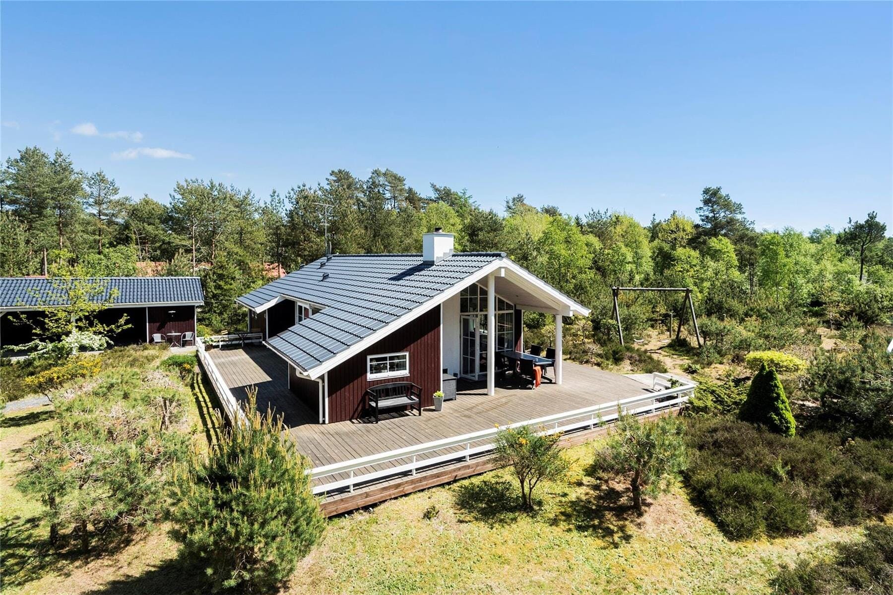 Das Haus ist auch außen eine Augenweide. Durch seine Schönheit und Präsenz bildet es mit dem herrlichen Waldgrund und der Natur vor der Haustür eine perfekte Synergie. Auf den Terrassen rund um das Haus können Sie die Sonne am Morgen und Abend genießen. Trotzdem das Haus im Wald steht, kommen die Sonnenstrahlen den ganzen Tag über auf das Grundstück.