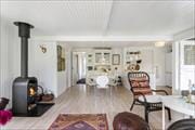 Das Ferienhaus strahlt eine gemütliche Sommerhausatmosphäre aus, vor allem durch den Kaminofen im einladenden Wohnzimmer, das in offener Verbindung mit dem Esszimmer und der neuen Küche aus dem Jahr 2023 steht. Hier kannst du gemeinsam mit der Familie Mahlzeiten genießen und gemütliche Stunden vor dem knisternden Kamin verbringen. Die moderne und gut ausgestattete Küche ermöglicht es dir, mühelos leckere Ferienmahlzeiten zuzubereiten. Vom Wohnzimmer aus hast du direkten Zugang zur großen Holzterrasse, die das Haus umgibt und eine perfekte Verbindung zwischen Innen- und Außenleben schafft.