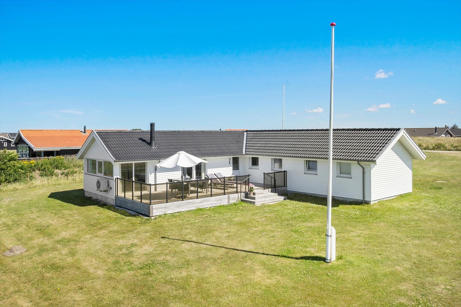 Auf beiden Seiten des Hauses haben Sie eine Terrasse. Vom Wohnbereich gelangen Sie direkt auf die Terrasse Richtung Westen, von wo aus Sie einen tollen Ausblick über die Gegend haben. Natürlich steht Ihnen auch ein Grill zur Verfügung, der dazu einlädt, die lauen Sommerabende mit gutem Essen draußen zu verbringen. Zum Haus gehört ebenfalls eine große Rasenfläche, welche viel Platz zum Spielen und Toben bietet.