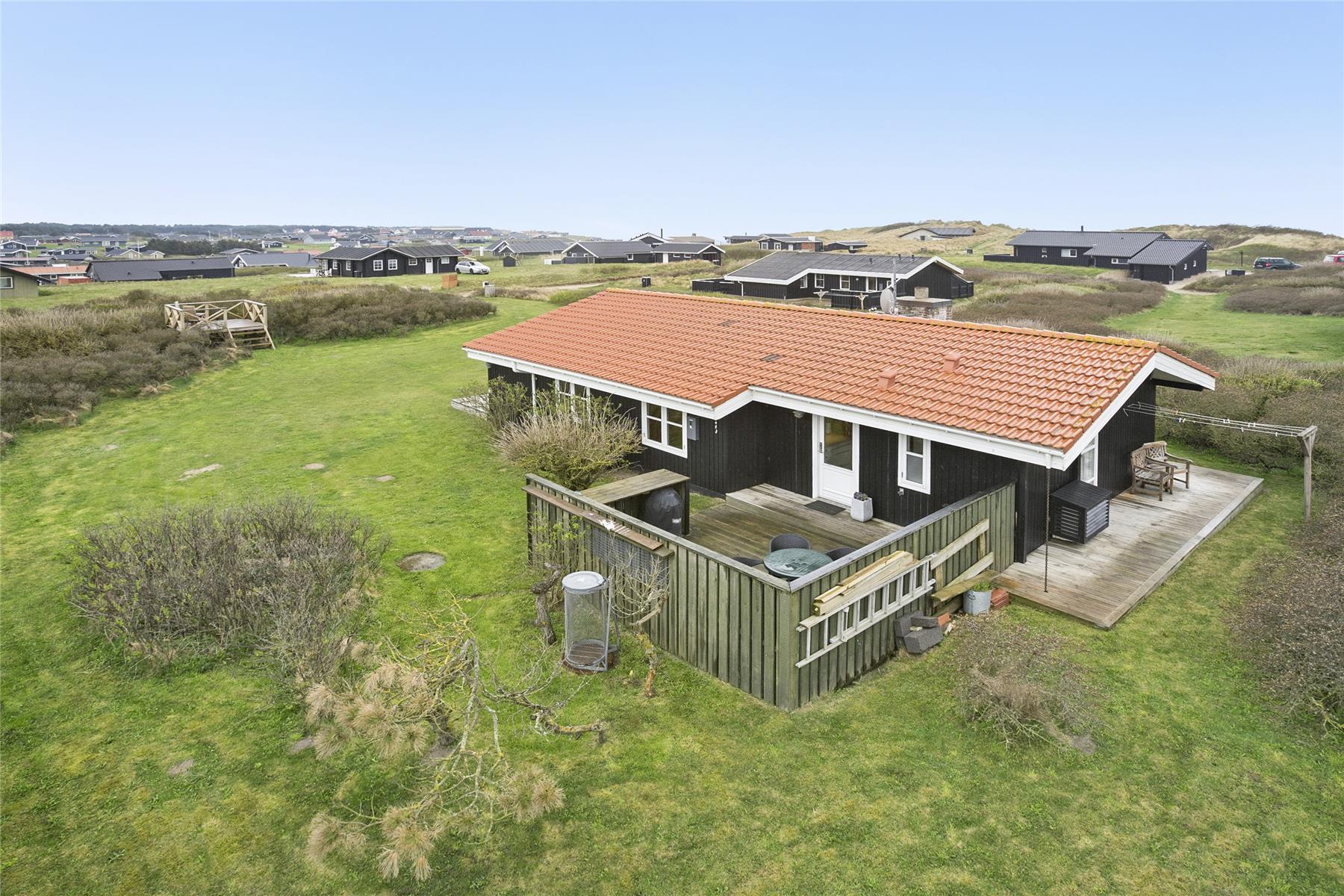 Das Ferienhaus liegt auf einem großen Rasenstück, das von Hagebutten und Sanddorn umgeben ist. Das Haus liegt hoch im Gelände und bietet einen Blick auf das gesamte Ferienhausgebiet in Richtung Nr. Lyngby. Nur ca. 100 Meter vom Haus entfernt führt im Sommerhalbjahr eine Treppe die steile Küste hinunter, die für Nr. Lyngby typisch ist, und führt zu dem breiten, weißen Sandstrand, der das ganze Jahr über ein herrlicher Aufenthaltsort ist.