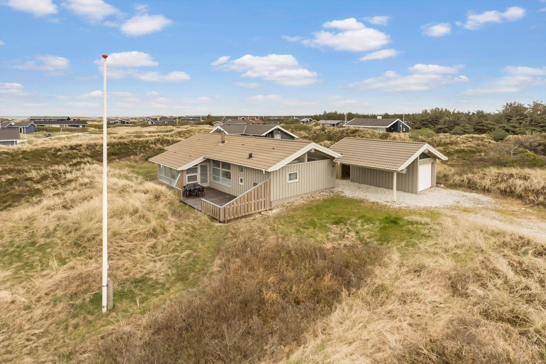 Beim Hauseingang steht Ihnen eine kleine Ostterrasse zur Verfügung. Vom Wohnraum gelangen Sie hinaus auf die große Terrasse voller Ruhe und Frieden. Auf dieser Terrasse können Sie sich nach Herzenslust von der Sonne verwöhnen lassen und den dänischen Sommer im Kreise Ihrer Lieben in vollen Zügen genießen. Da das attraktive Urlaubsdomizil nur gut 250 Meter von der Nordsee entfernt liegt, hören Sie im Freien das Rauschen der Wellen und riechen den frischen Duft des Meeres. Gute Gartenmöbel, Liegestühle und ein Grill stehen selbstverständlich zu Ihrer Verfügung und machen die Erholung perfekt.