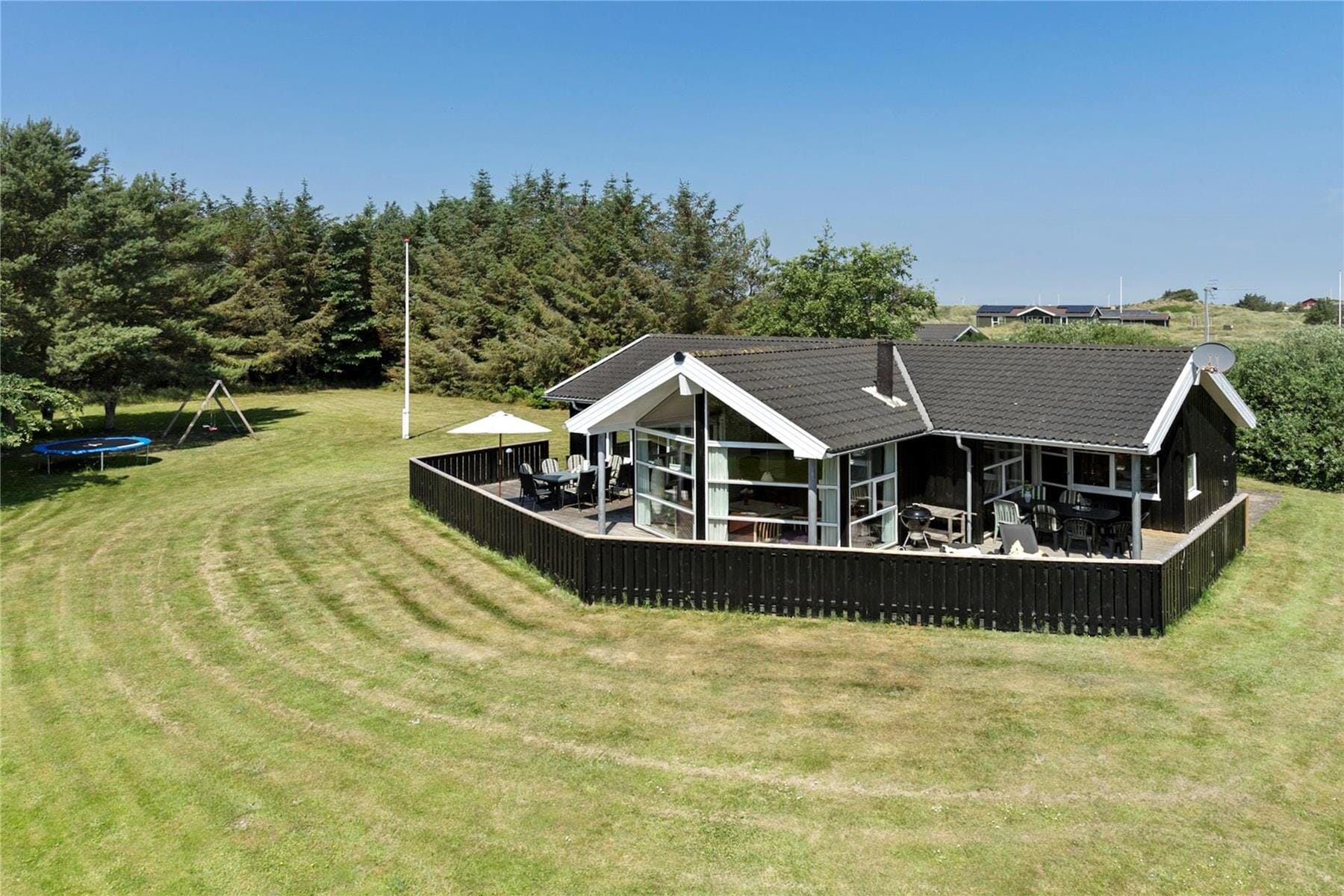 Vom Wohnzimmer aus gelangt ihr direkt auf die nach Süden ausgerichtete Terrasse, die groß und sonnig ist. Ein Teil der Terrasse ist überdacht, und es gibt auch eine kleinere, nach Norden ausgerichtete Terrasse, auf der ihr euch im Schatten entspannen könnt. Wenn es Zeit wird, die Gartenstühle zu verlassen, bietet die große Rasenfläche viel Platz für Spiele und Aktivitäten im Freien. Für die kleinen Gäste gibt es Schaukeln und ein Trampolin im großen und geschützten Garten.