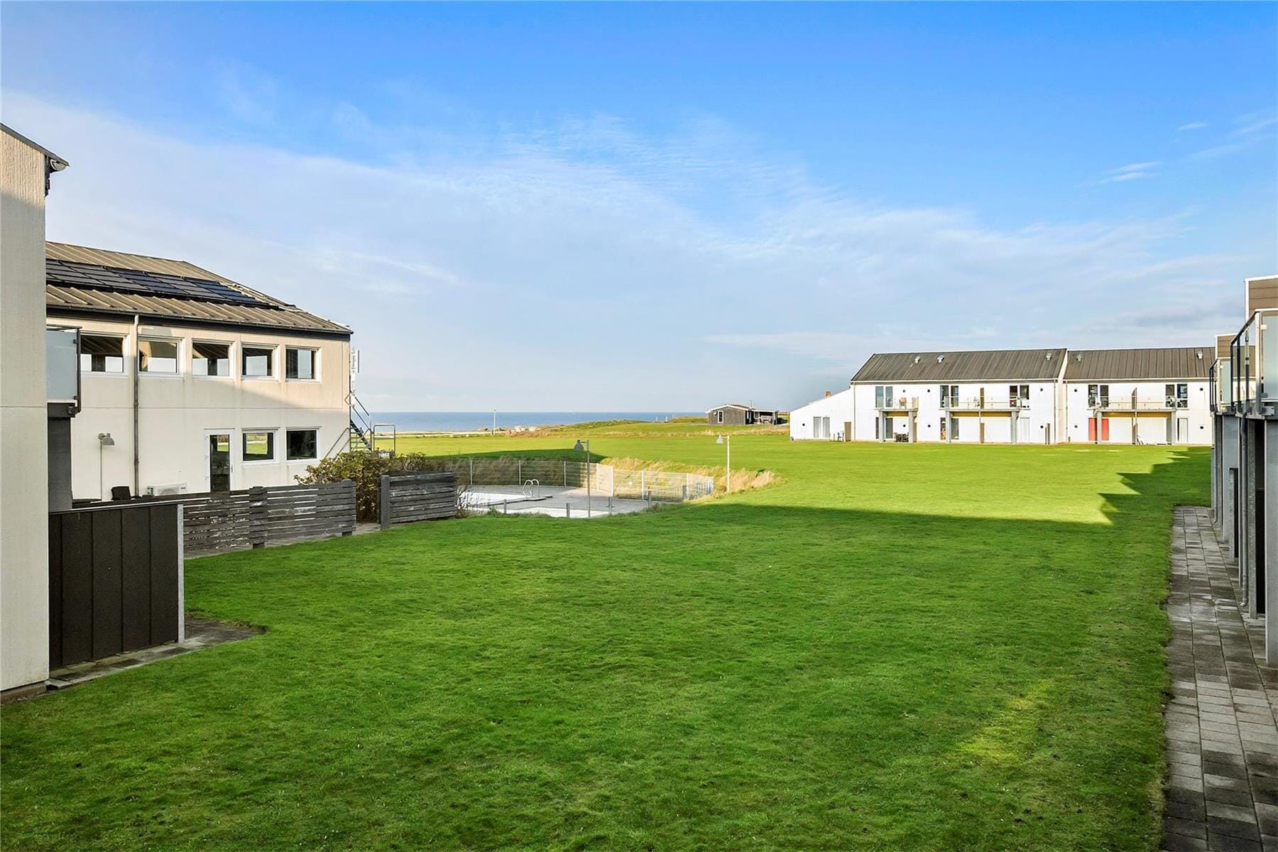 Das Leben lässt sich auch wunderbar auf der gefliesten Terrasse der Wohnung genießen, die an das Wohnzimmer angrenzt. Oder stellen Sie die Gartenmöbel auf die große Rasenfläche und genießen Sie die Sonne sowie den Blick auf die Nordsee und den weiten Himmel. Wenn das gute Sommerwetter Lust auf ein Bad macht, haben Sie freien Zugang zum Außenpool des Ferienzentrums, der sowohl ein tiefes Schwimmbecken als auch ein flacheres Kinderbecken bietet – beide können von Juli bis August genutzt werden. Zu den Gemeinschaftseinrichtungen gehören auch ein Spielplatz, und das Restaurant des Zentrums hat während der Hauptsaison und an Wochenenden geöffnet, während ein kleiner Laden in den Sommermonaten geöffnet ist.